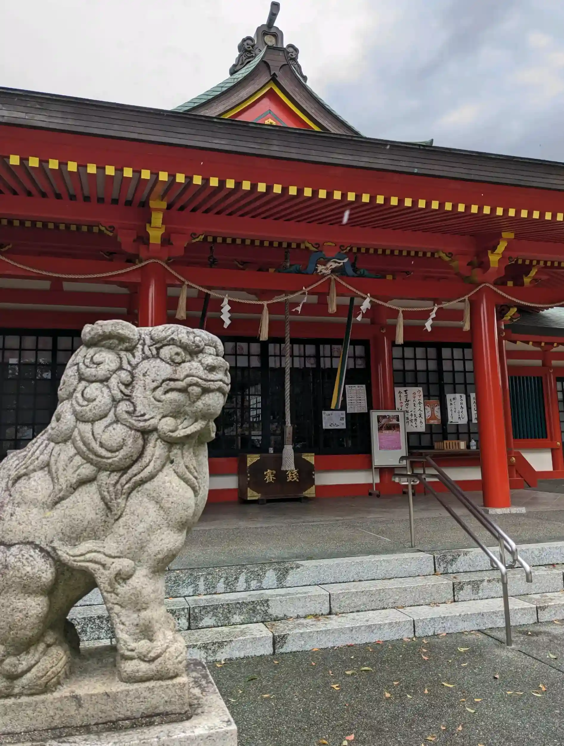 赤い拝殿と狛犬