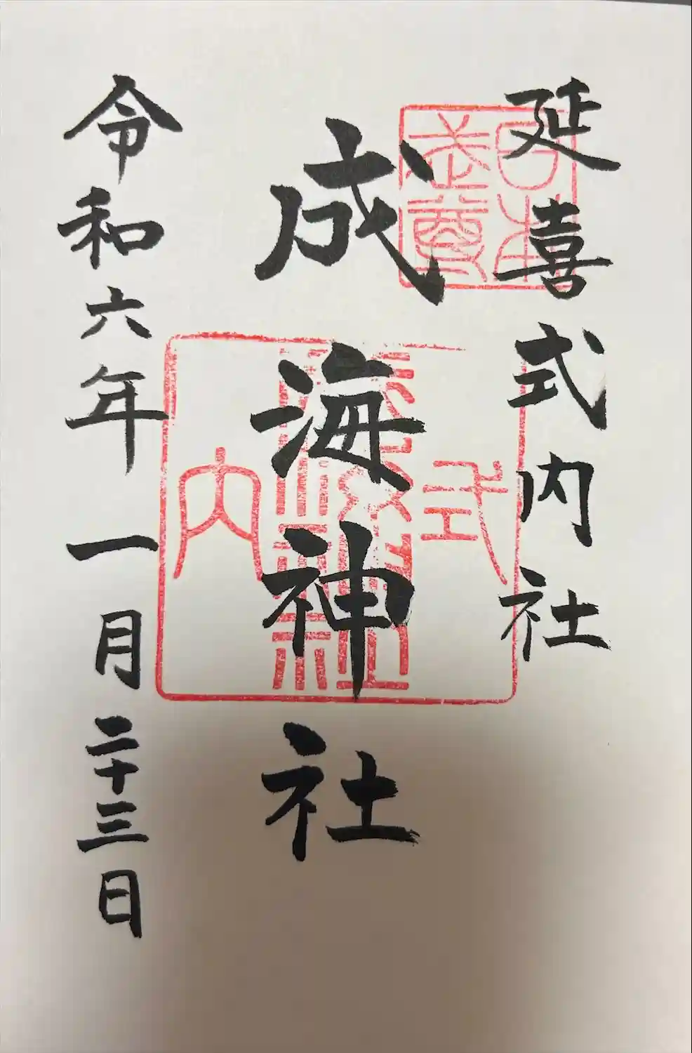 「成海神社」さんの直書きの御朱印を頂きました。愛知県警察緑警察署の挿み紙もありました。