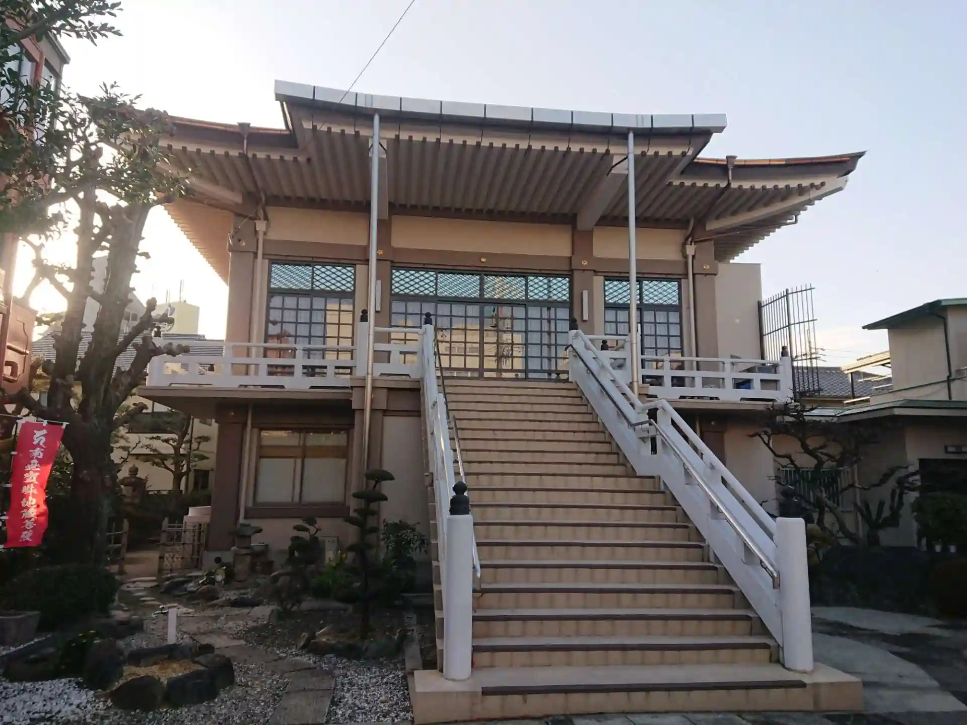 門から階段を上がるちょっと緊張する本堂です。