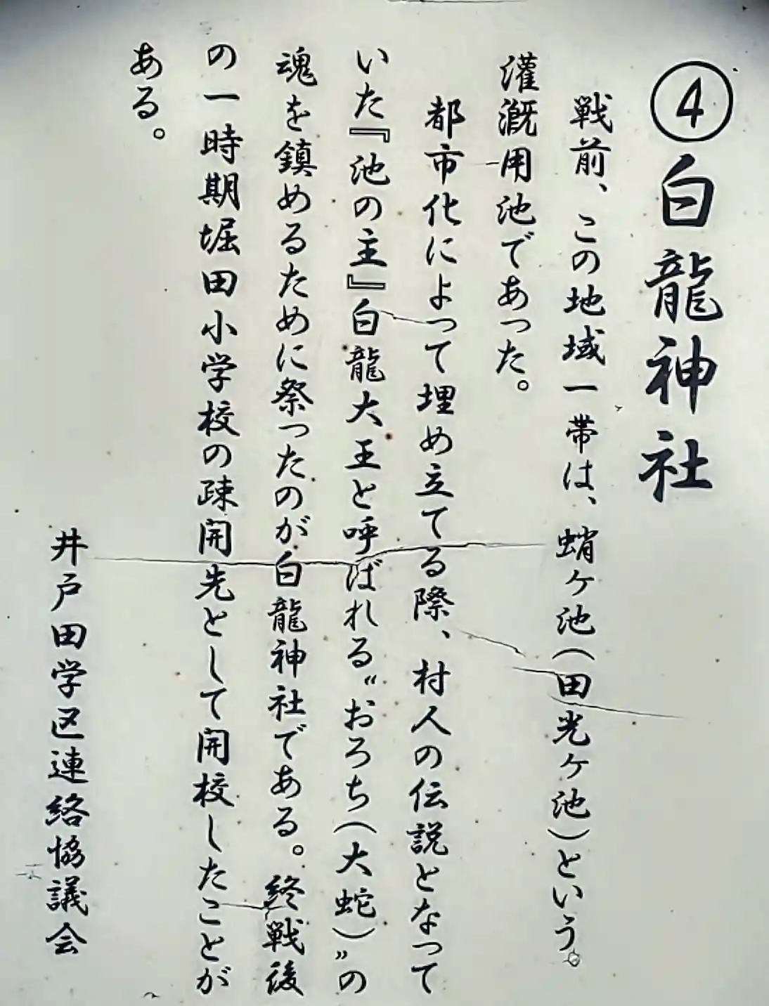 かつて近くに「田光池」という溜め池がありました。龍神様の怒りを鎮める為に白龍社を建てたとか。