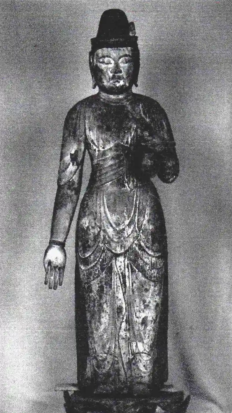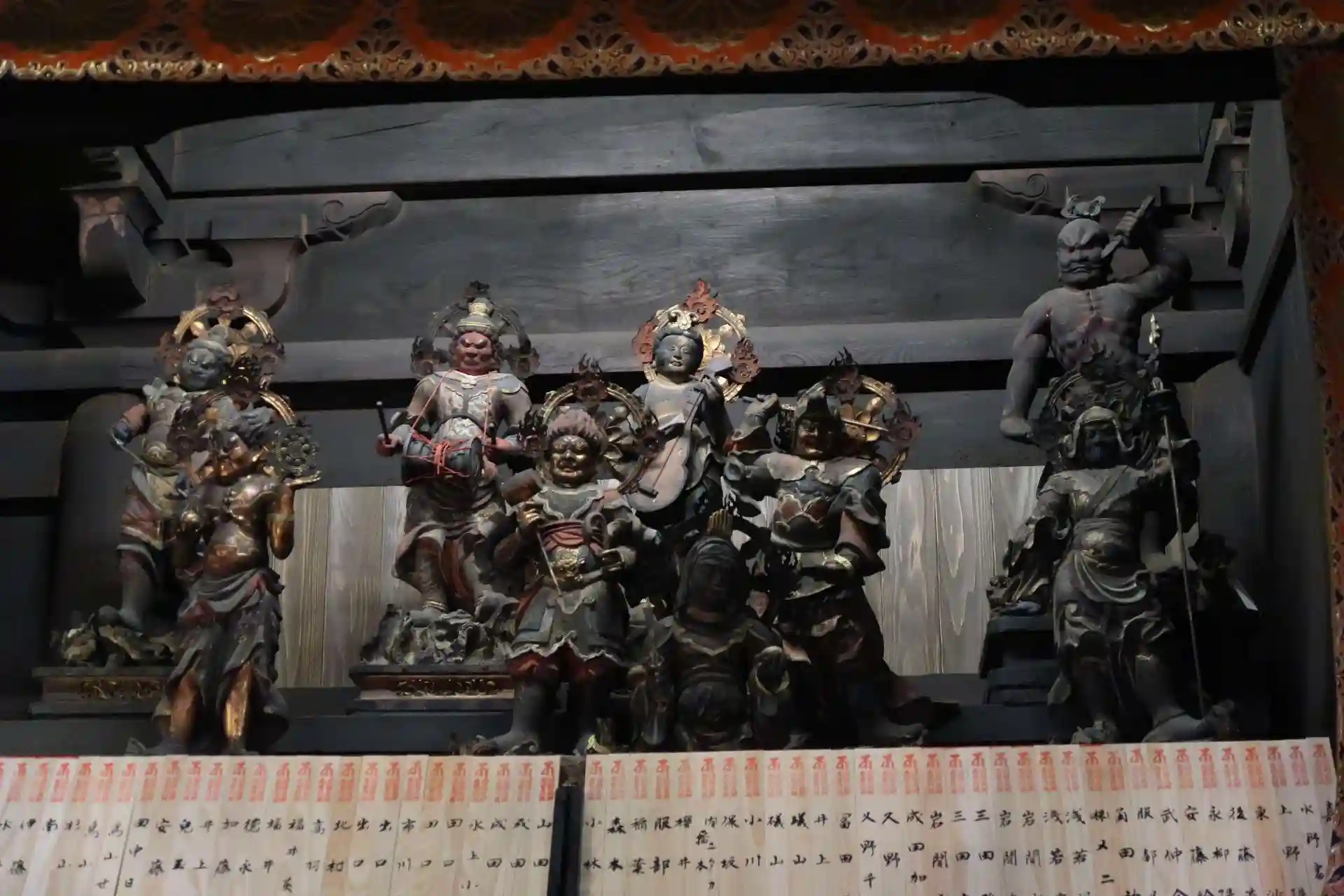 早速、本堂へ。通常は外陣からの参拝ですが、本日は内陣へ入れます。内陣の須弥壇には本尊お前立ち、笠を被っています。須弥壇の右上・左上の脇間には金剛力士像、四天王像、十二神将像でしょうか、17躯の仏像が安置されていました。秘仏本尊はというと、内陣の後ろに収蔵庫が繋がっていて、収蔵庫の中に安置してありました。秘仏本尊・十一面観音も笠を被っていて、笠を結ぶ赤い紐もあって、宝髻(ほうけい)や化仏(けぶつ)は見えずやや残念。距離もややあって正直見辛いです。高さ約160cm、一木造り、襞の彫りは浅め、お顔は丸いです。平安時代後期の作と思われます。