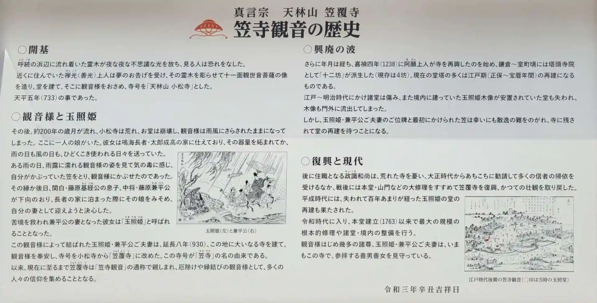 雨ざらしでびしょぬれだった観音さまを見て、自分がかぶっていた笠をかぶせた玉照姫(たまてるひめ)が藤原兼平公にみそめられ、のちに結びれました。その巡り合わせを深く観音さまに感謝し、この地にお堂を建て、そこに笠をかぶせた観音さまをおまつりし、笠をかぶった寺=笠覆寺(りゅうふくじ)と名付けたことから、笠寺の名の由来となったと伝わります。