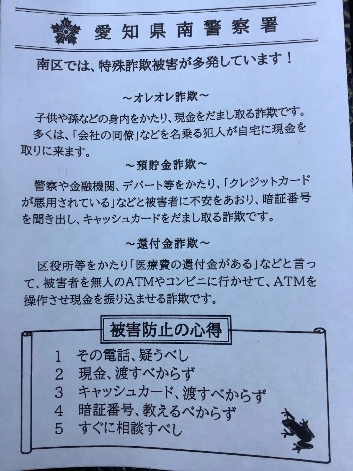 愛知県南警察署からのお知らせ、富部神社の蛙がえがかれているお