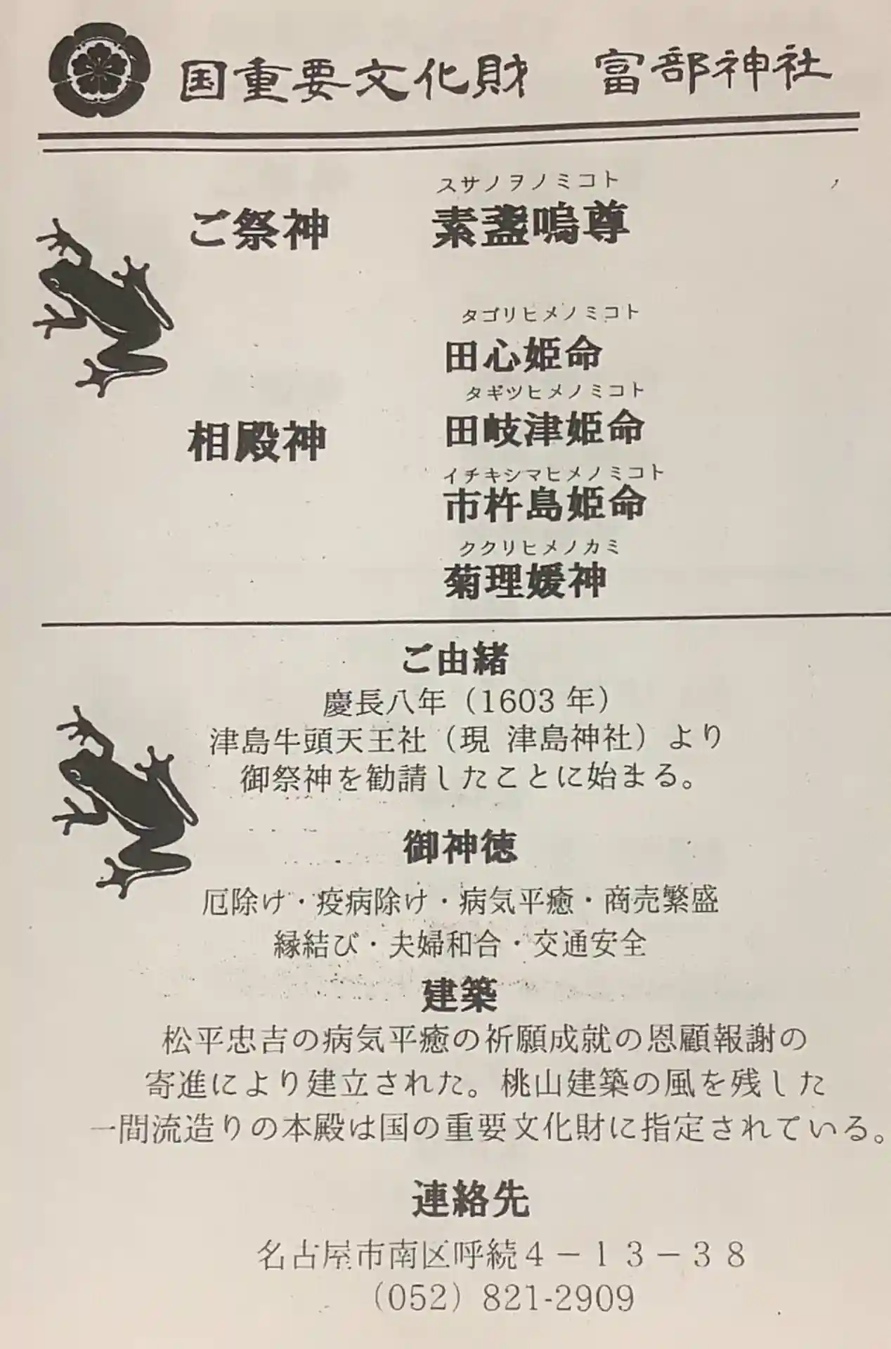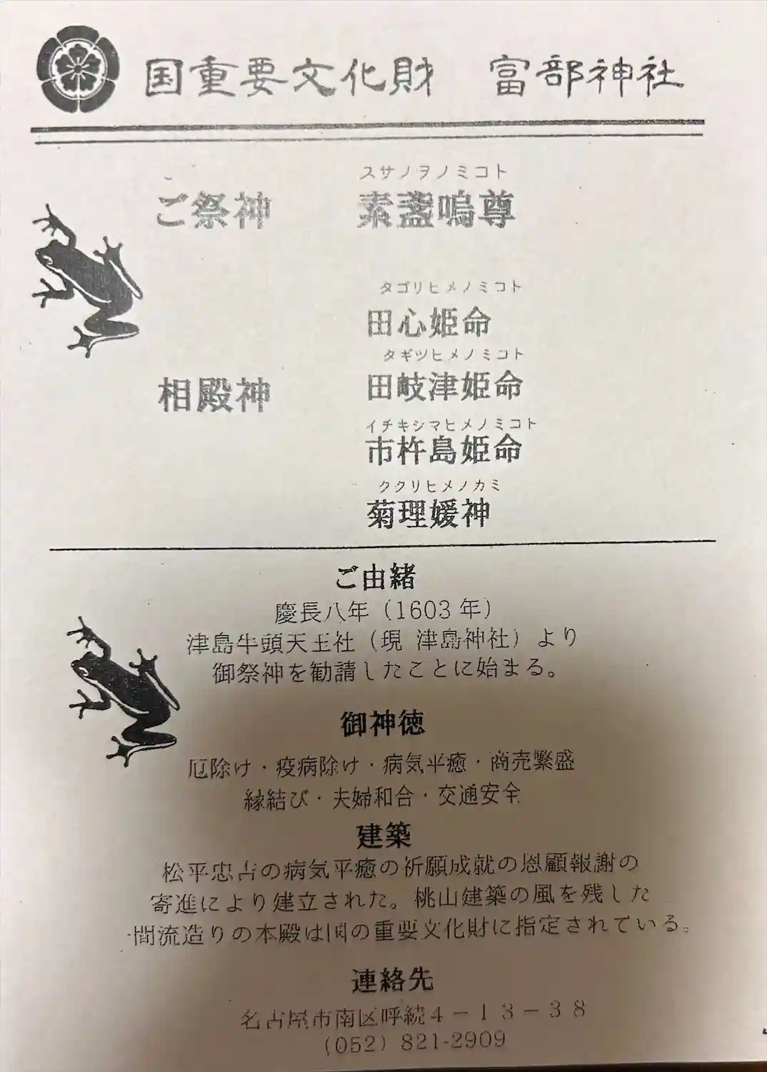 愛知県名古屋市、富部神社を参拝。かえるのモチーフの授与品が多く、御朱印にも隠れています。徳川家康公…