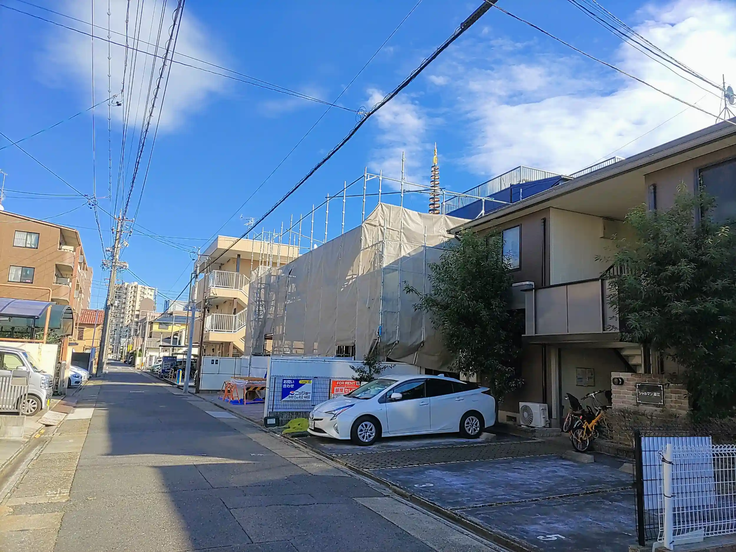 住宅街の並びに在りました。どうやら改築中らしいです。かろうじて相輪が見えました。