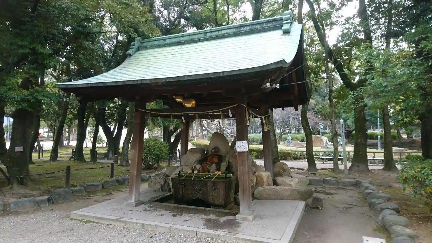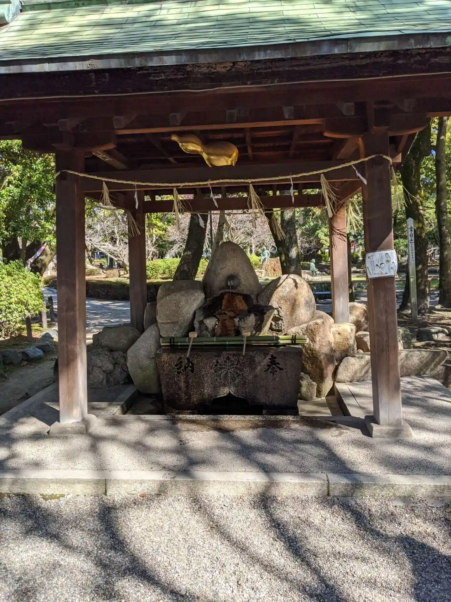 金のひょうたんが特徴的な手水舎です。水が出る所もひょうたんでした。