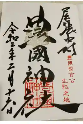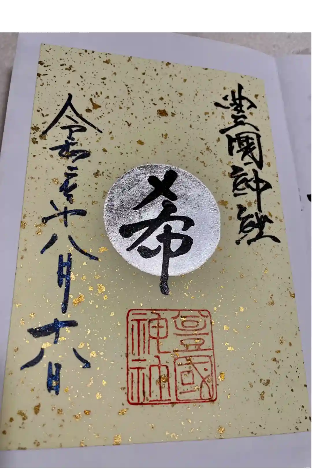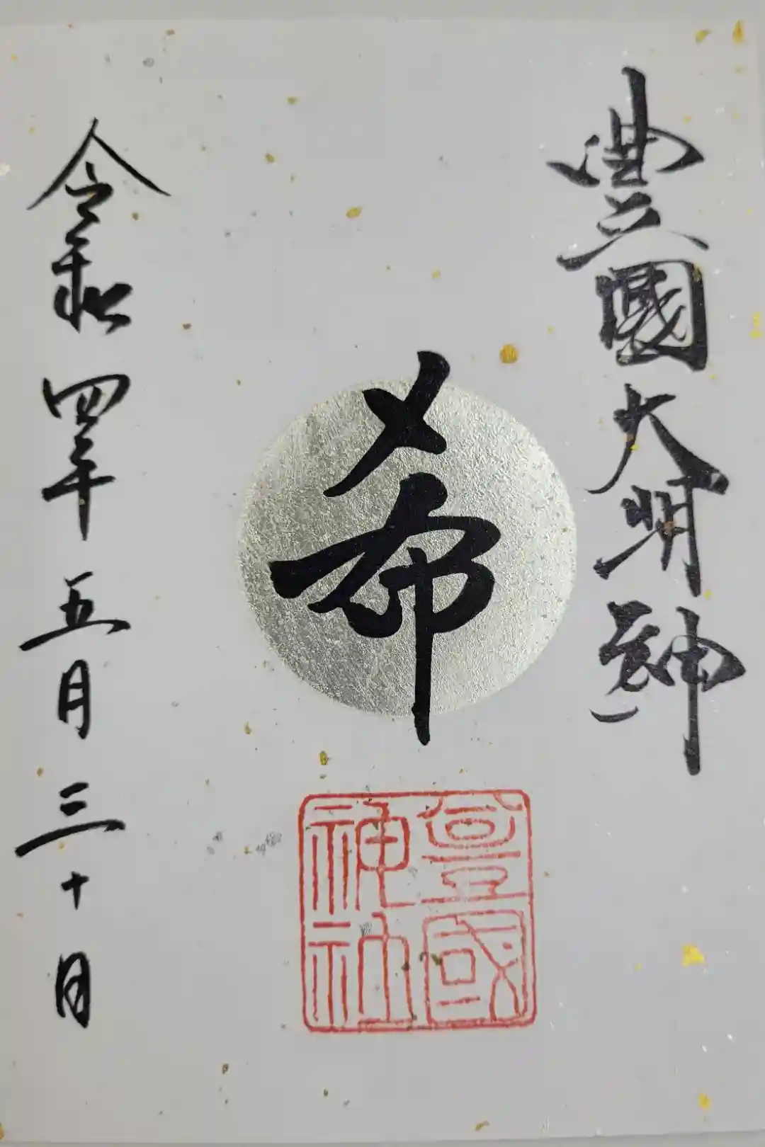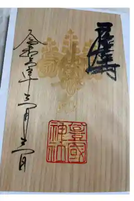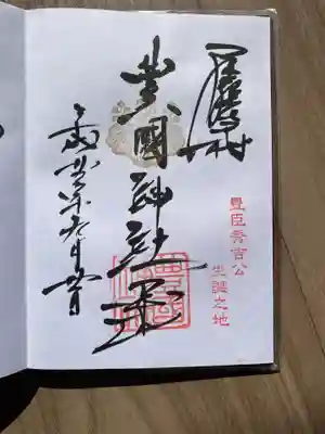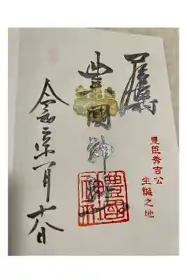 名古屋は中村にある太閤秀吉様の出生地に勧請してある豊国神社、太閤様の命日年に一度しか出されない御朱印(月替わりものとは違う)です。他と違う点は、中心が金箔で銅墨で夢と書いてあります。夢の理由は太閤様が詠まれた辞世の句の文字からです。