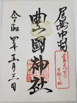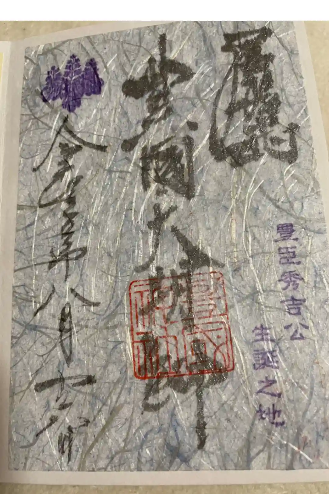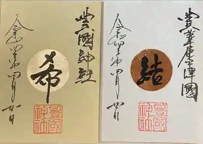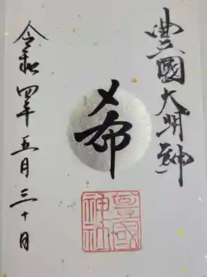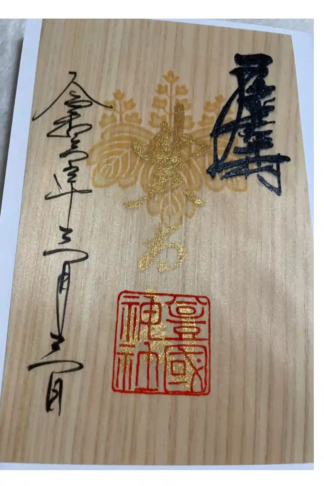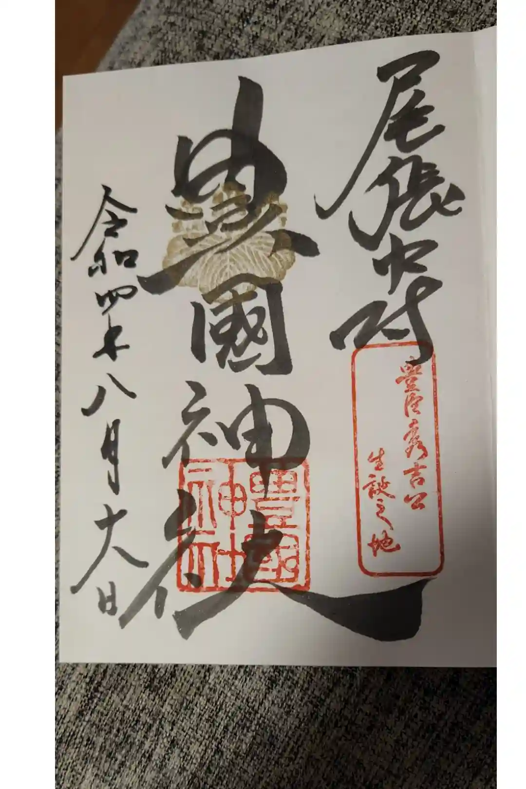 名古屋は中村にある太閤秀吉様の出生地に勧請してある豊国神社、太閤様の命日年に一度しか出されない御朱印(月替わりものとは違う)です。他と違う点は、中心が金箔で銅墨で夢と書いてあります。夢の理由は太閤様が詠まれた辞世の句の文字からです。