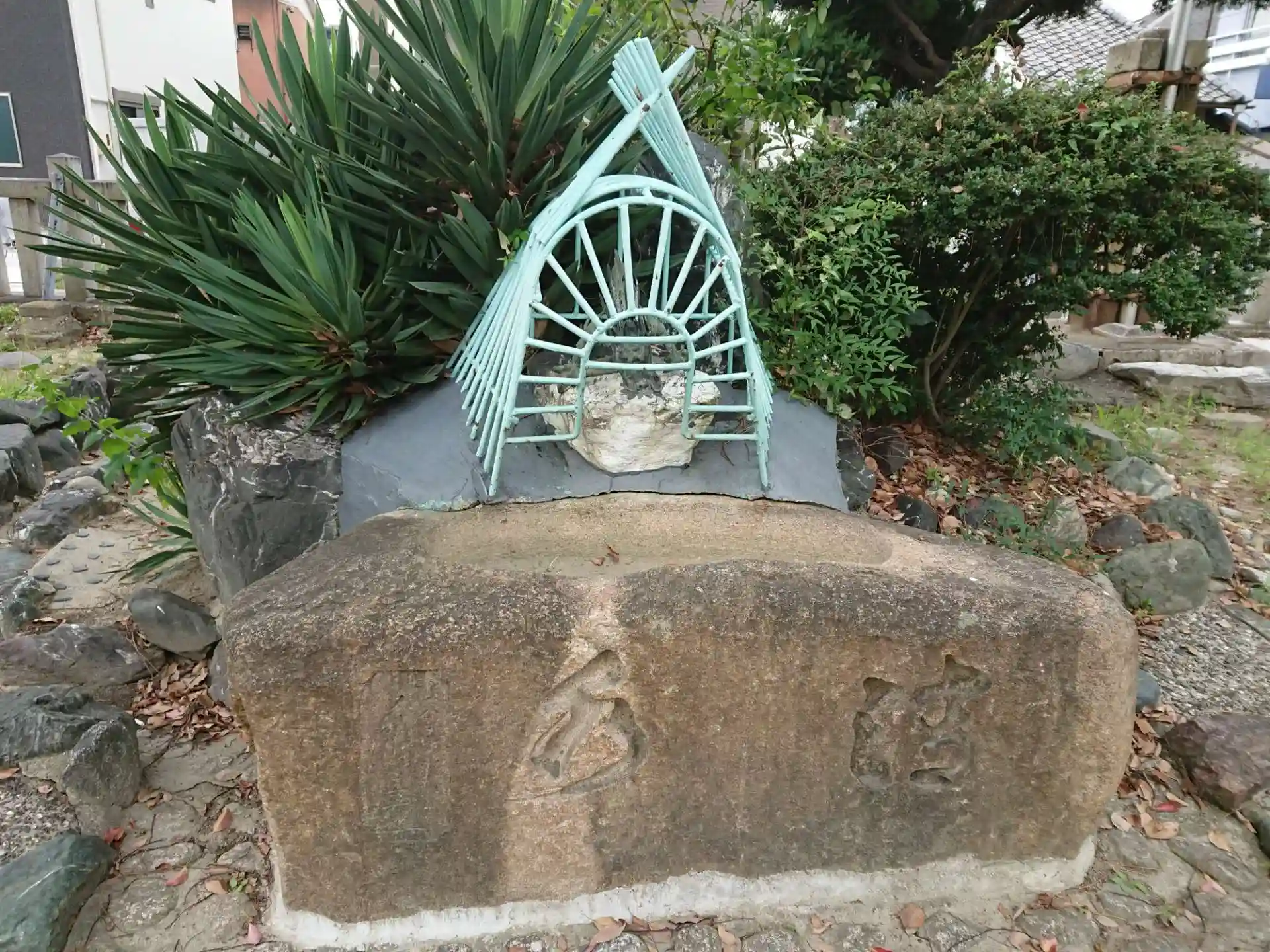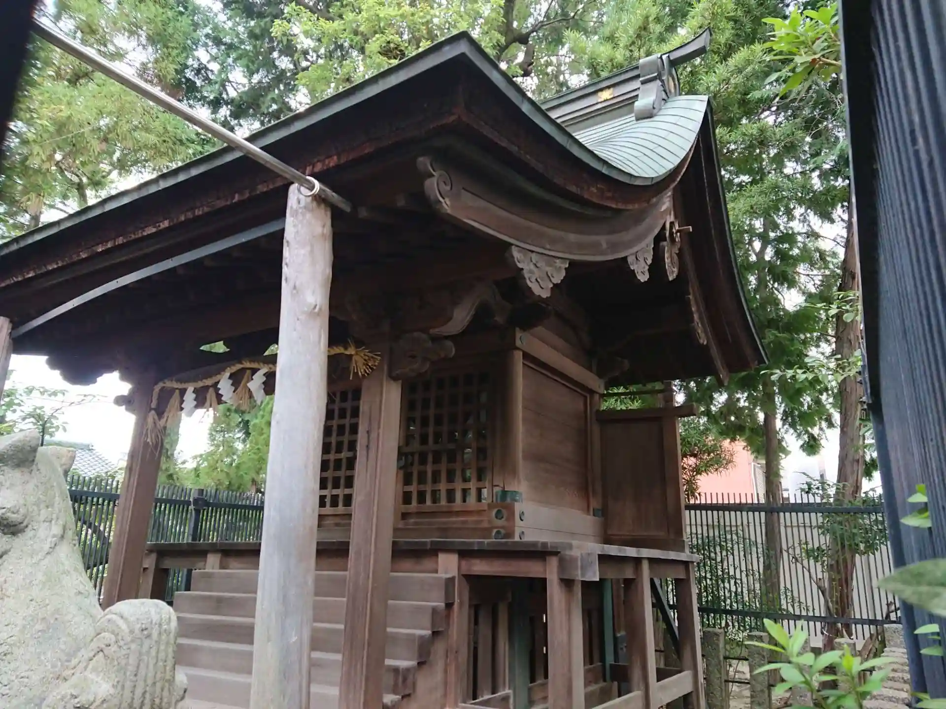 住宅地に赤い鳥居が目立ちました。手水舎の龍が檻に入れられているみたいでした。