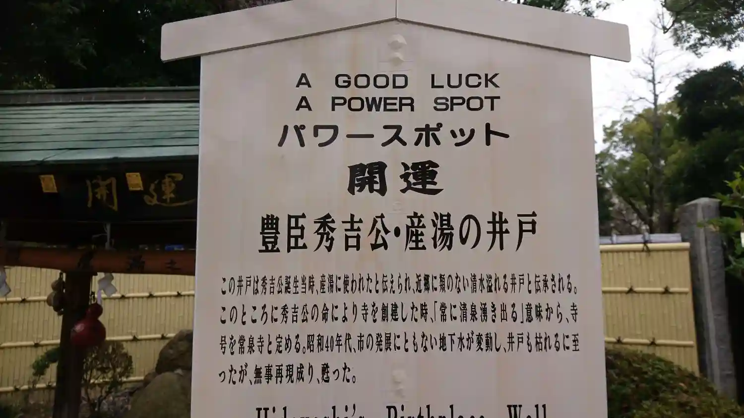 本堂には400年前に大阪城の秀頼から譲り受けたと伝わる秀吉公の木像や寺宝が多く収められ、境内には秀吉公が生まれた時に身体を洗われた「産湯の井戸」、秀吉公が11歳の時に自らの手で植えられた「お手植えの柊」などがあります。 本堂の秀吉公の木像は日に日にお顔の表情が変わる不思議なお像です。