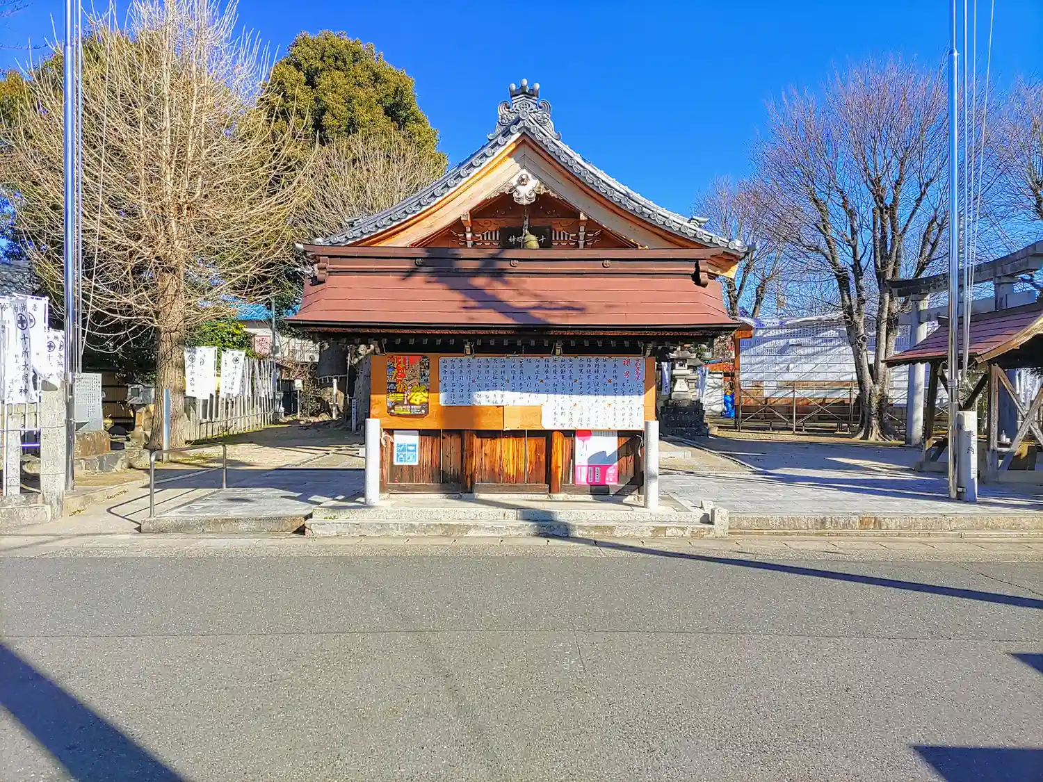 | ご由緒 | 神前より約180mの参道があって、その端に赤鳥居と鳥居につるす大注連縄が飾られていたが、現在は敷地の都合で東門に大注連縄が飾り付けられている。