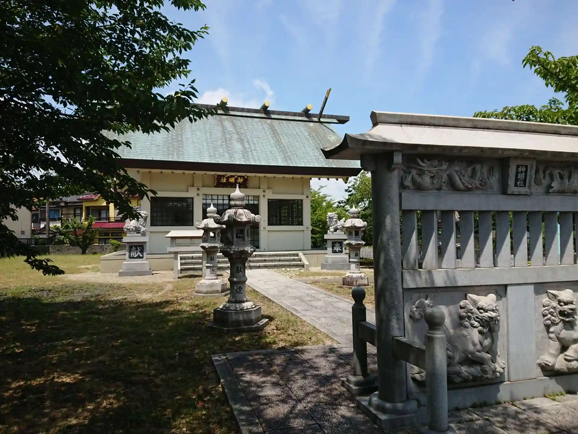 蕃塀の向こうに綺麗な社殿があります。