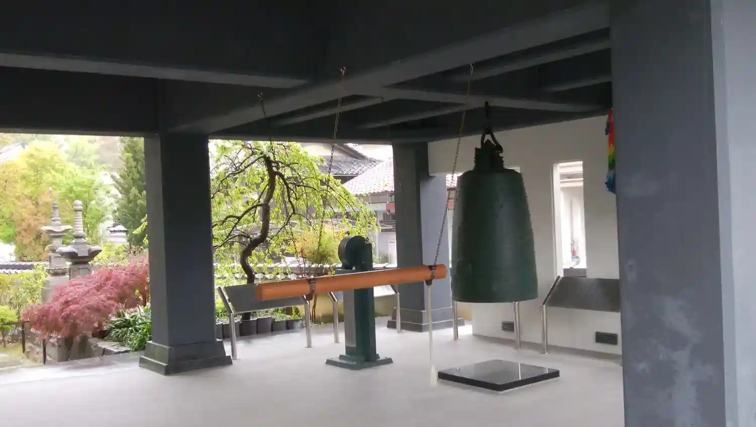 大きくて立派な本堂のある寺です。鐘は少し高い所にあるものだと思っていましたが、境内の中で水平移動で…
