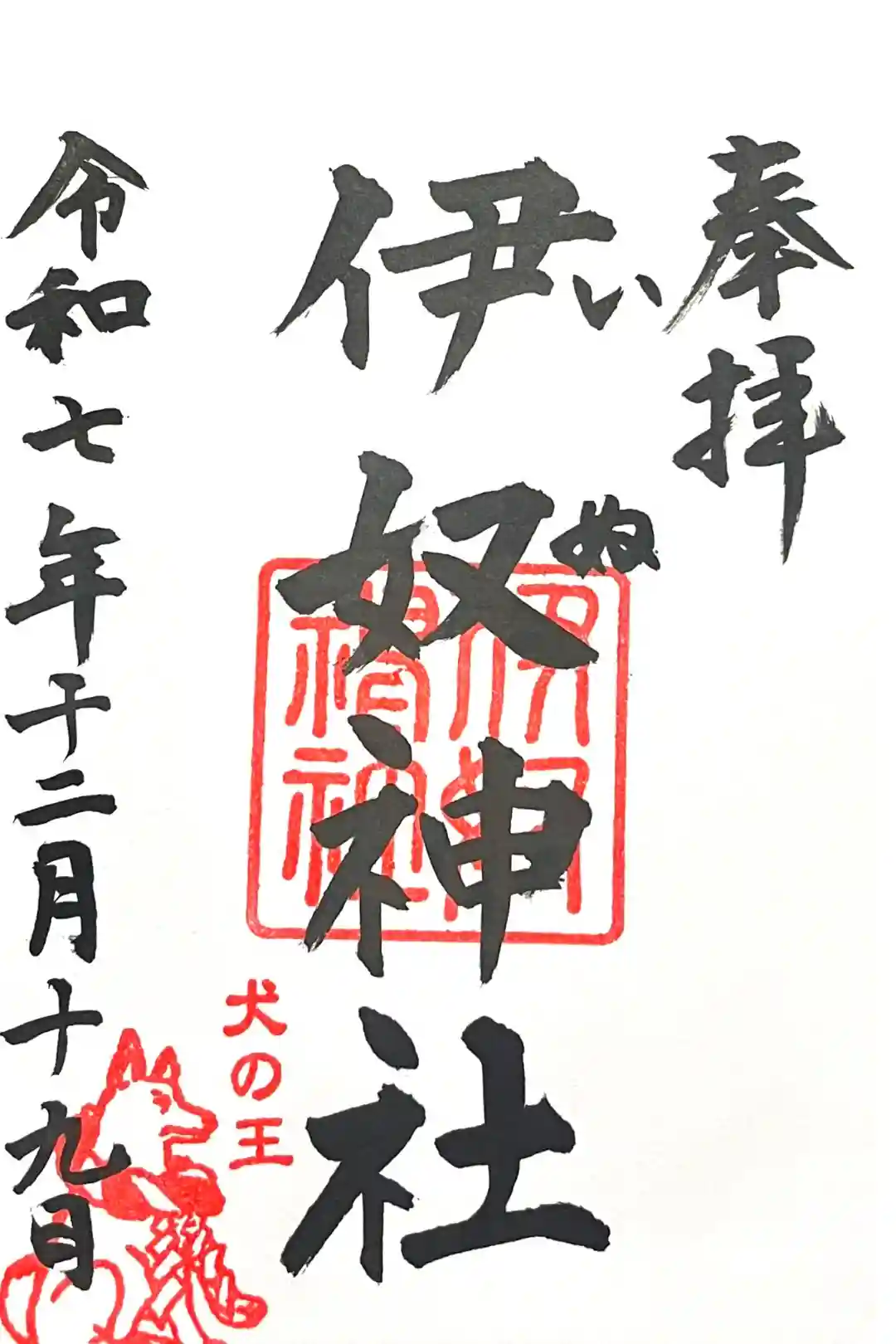 真ん中に伊奴神社と書かれ、その右にいぬと読みがなが書かれ、真ん中に伊奴神社の社印、左下に犬の王の印が押された御朱印です。