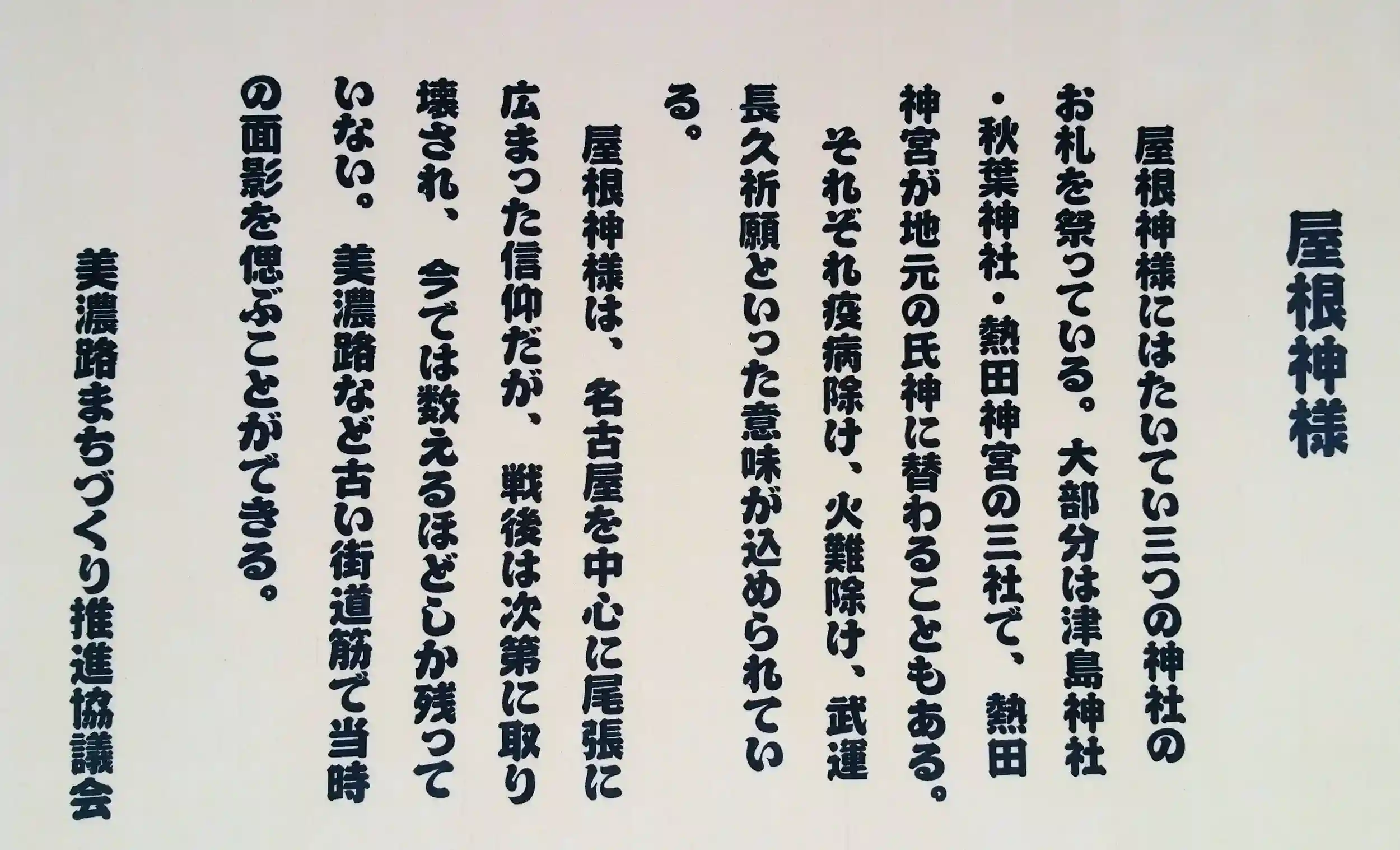 梵天祭では、八幡社を出発し各屋根神様をまわり終点の神明社まで練り歩くようです。地域の人にとってはなくてはならない屋根神様のようです。