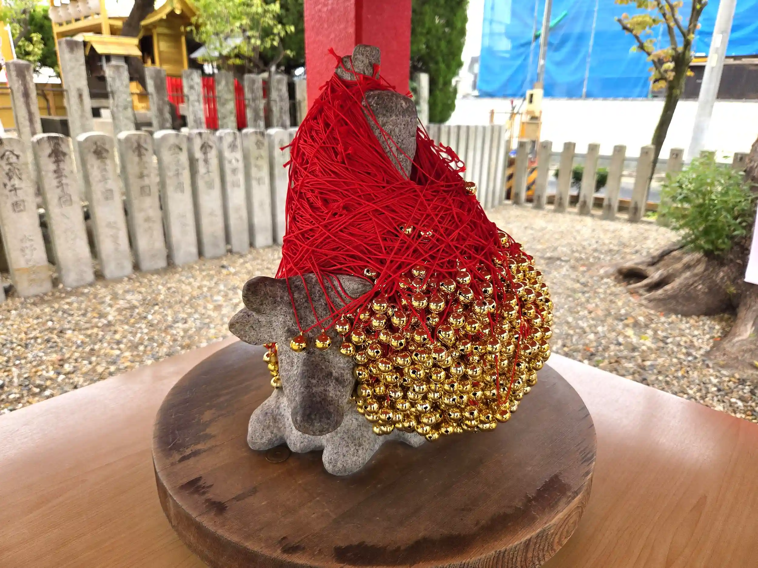 下の部分が牛で、その上に道真公が座っているようなのですが、多くの鈴が掛けられていて道真公の顔が埋もれかけています。