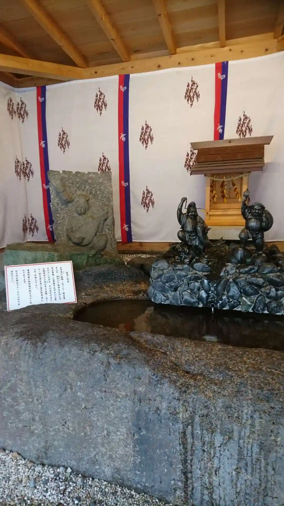 すぐ隣で銭洗いできます。恵比寿様と大黒様に三回ずつ柄杓でお水をかけ、流れてきたお水でザルに入れたお金を洗います。