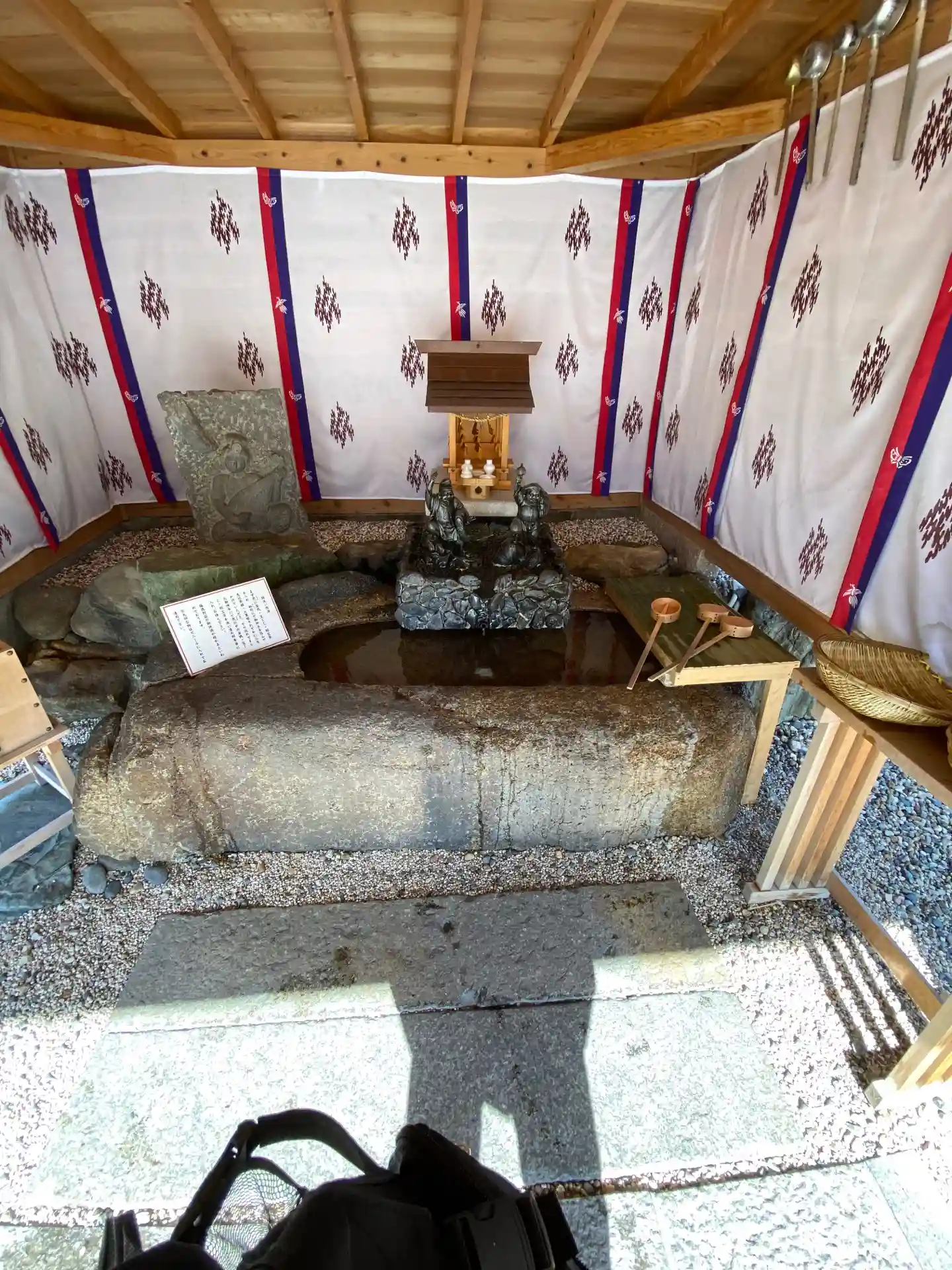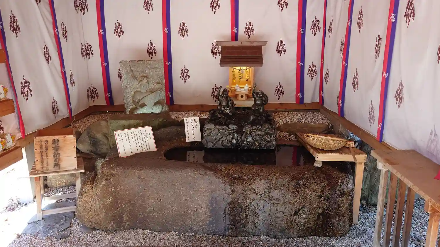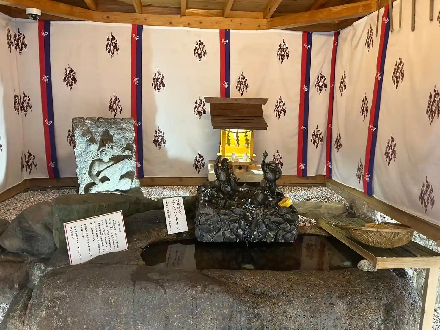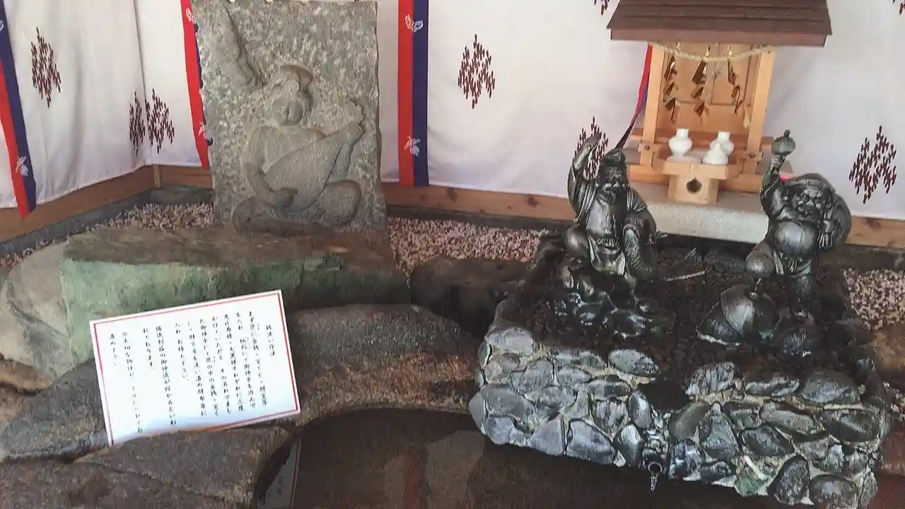 ざるにお金などを入れて水を柄杓ですくってかけるのですが、その水はまず恵比須様と大黒様に3回ずつかけ流れ出てきた御神水でざるの中のものを洗い清めるとのこと。