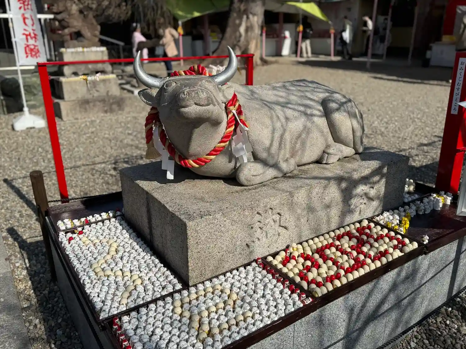 下の部分が牛で、その上に道真公が座っているようなのですが、多くの鈴が掛けられていて道真公の顔が埋もれかけています。