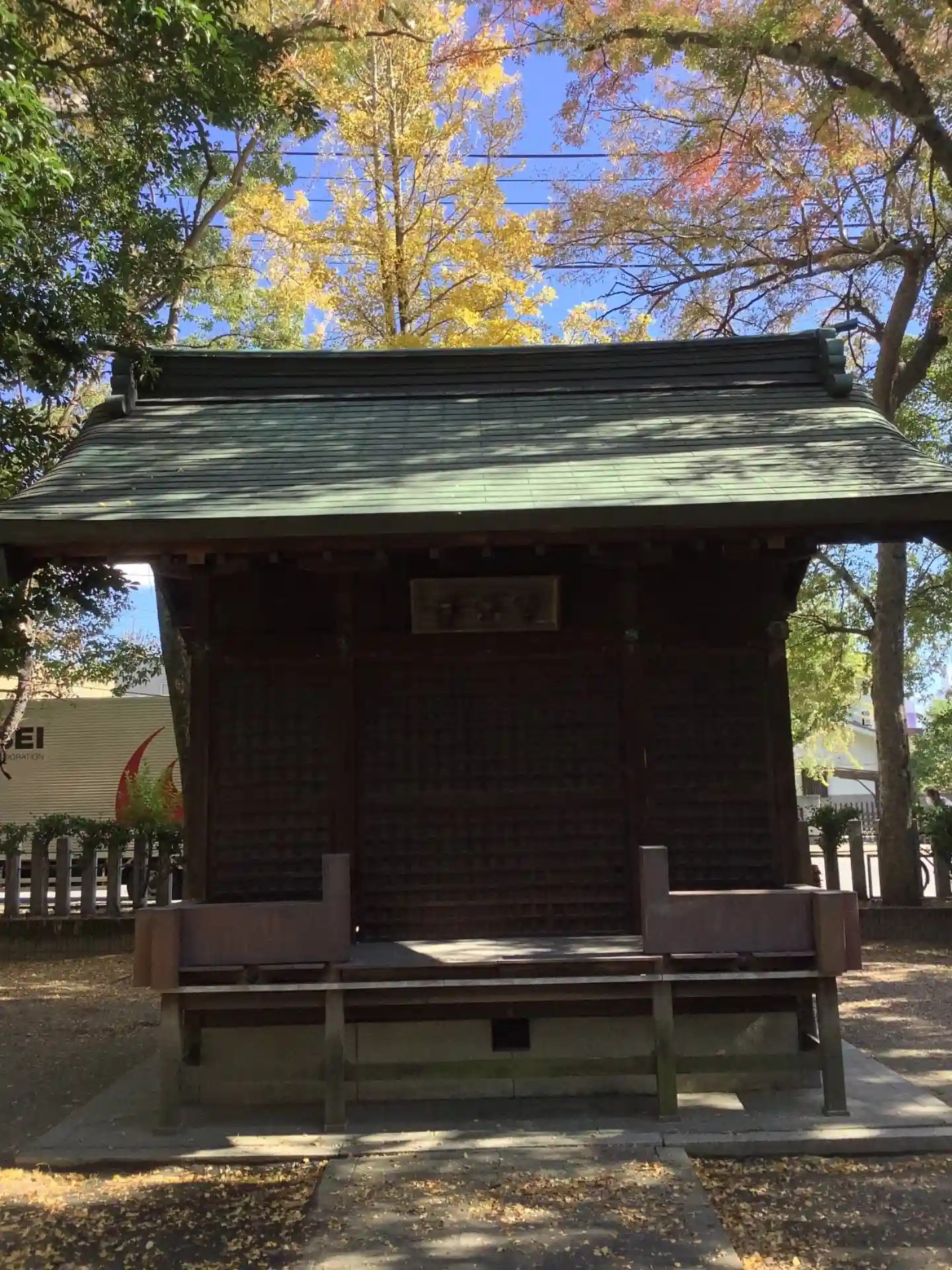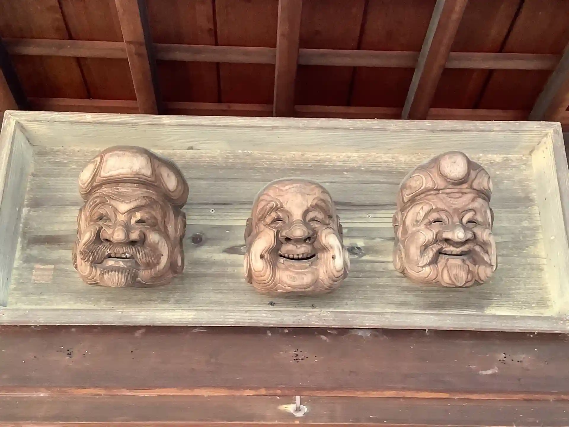 境内内には広く、神楽殿(木造)があり入り口?に翁の面が3枚設置してあります。
