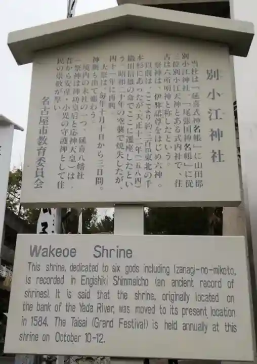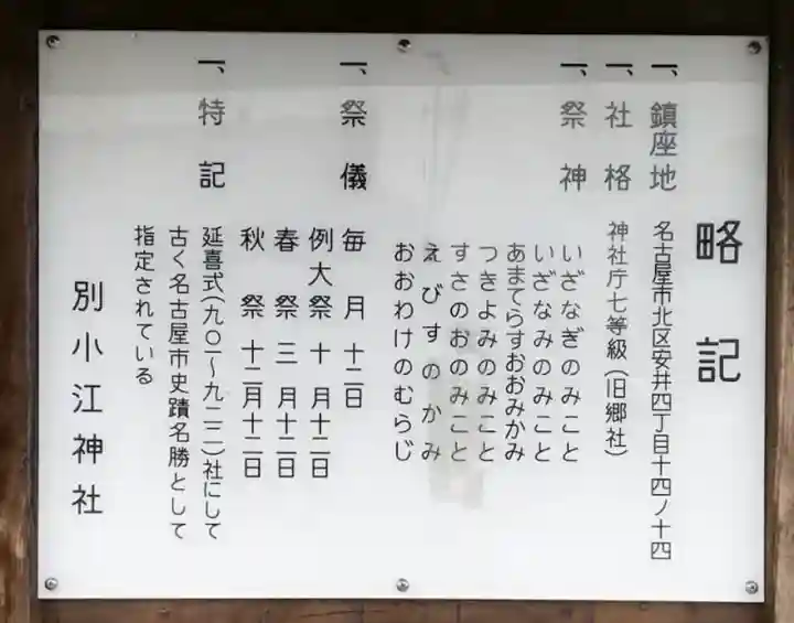 | ご由緒 | 『延喜式』に「尾張国山田郡別小江神社」、『本国神名帳』に「従三位別小江神社」とある式内社。