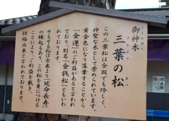この三葉松は全国でも珍しく、神聖な木として崇められています。黄金色になり落葉することから「金運」のご利益があると言われており、別名「金銭松」とも言われております。