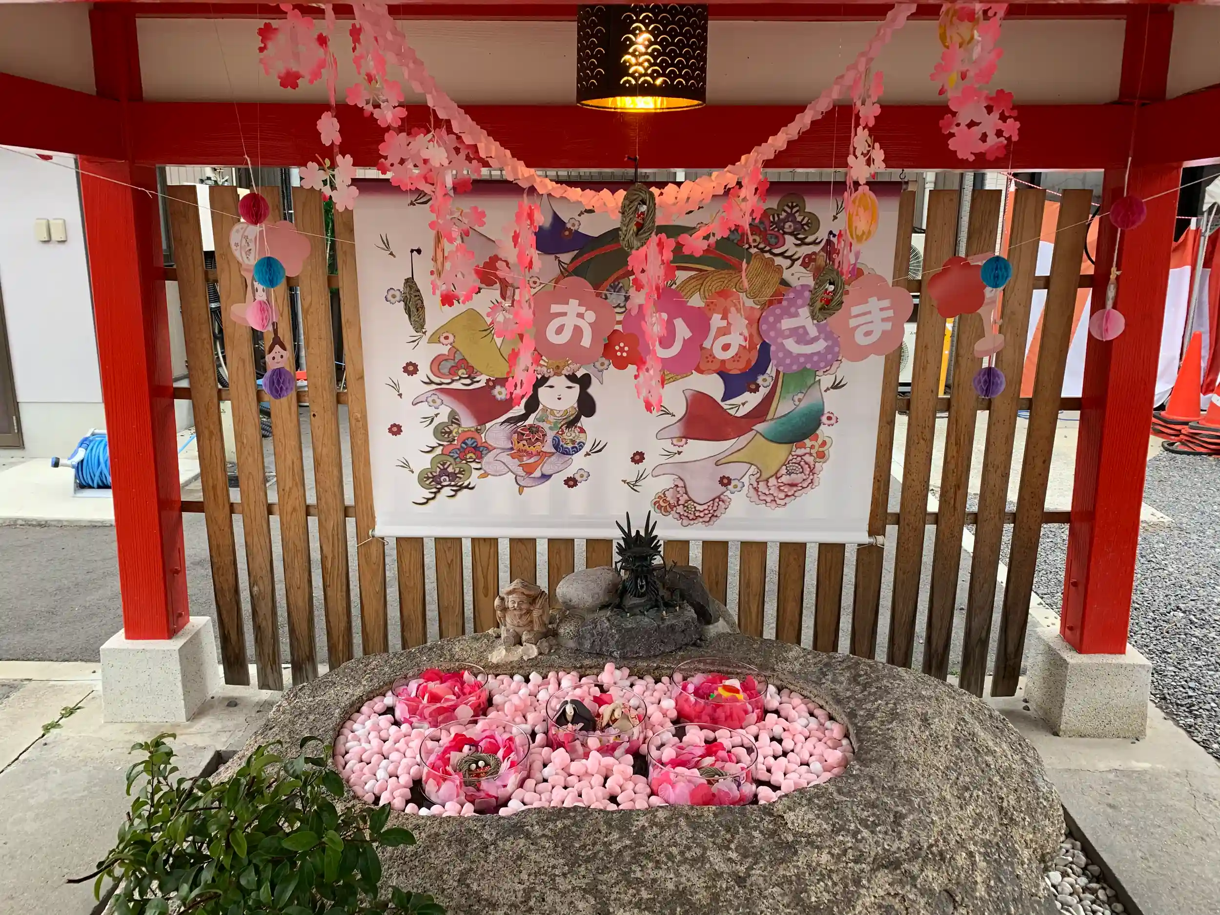 可愛い女の子の赤ちゃんを抱っこしなが、苦労してスマホで写真を撮影している若いご夫妻がいたので、拝殿前と中の雛壇(?)の前で私が写真撮影😊