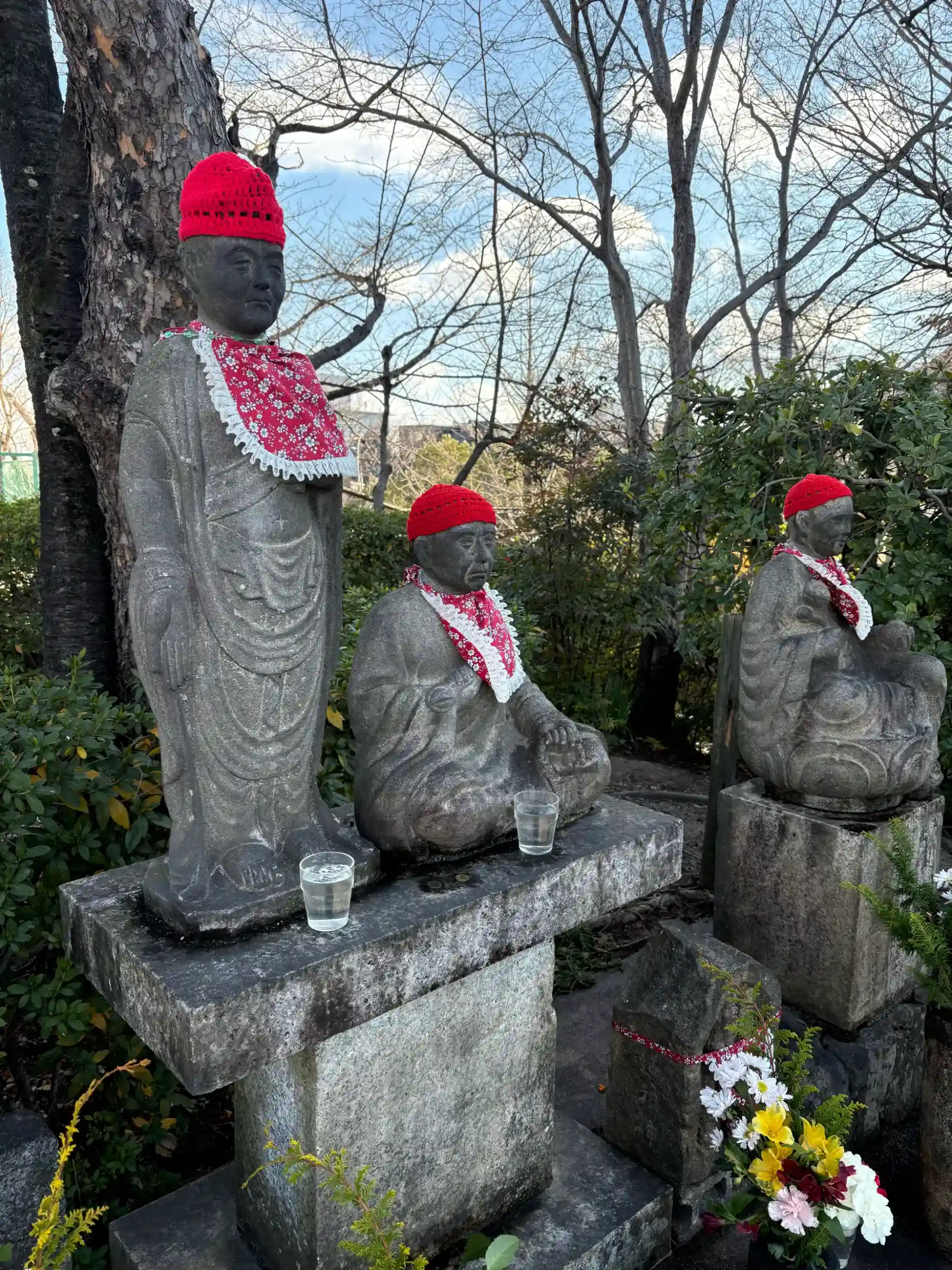 ところで門前や姫が池に続く道筋には、四国八十八ヶ所霊場の写しが点在します。新年にはそれらの石仏の前掛けや帽子が新調されるのですね。真新しい前掛け•帽子の赤が青空の下で輝いていました。