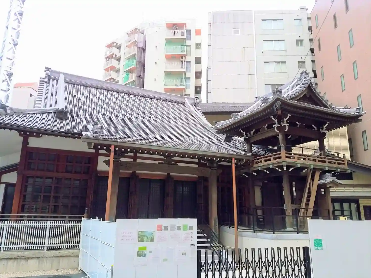お寺の入り口が工事現場の入口になっており、お…