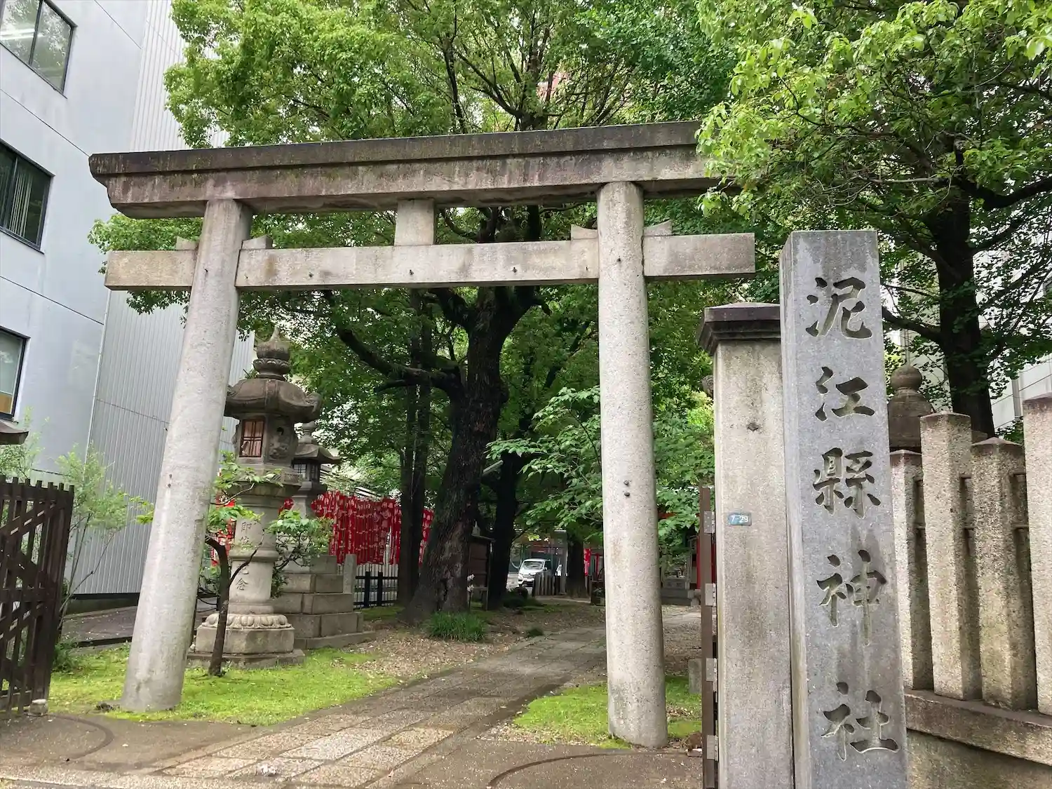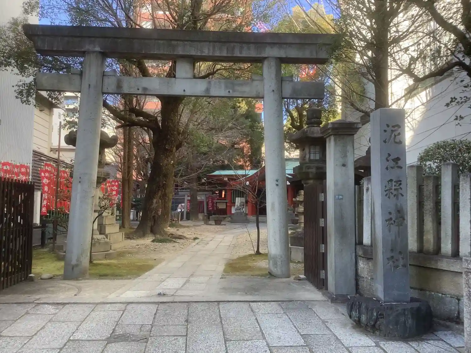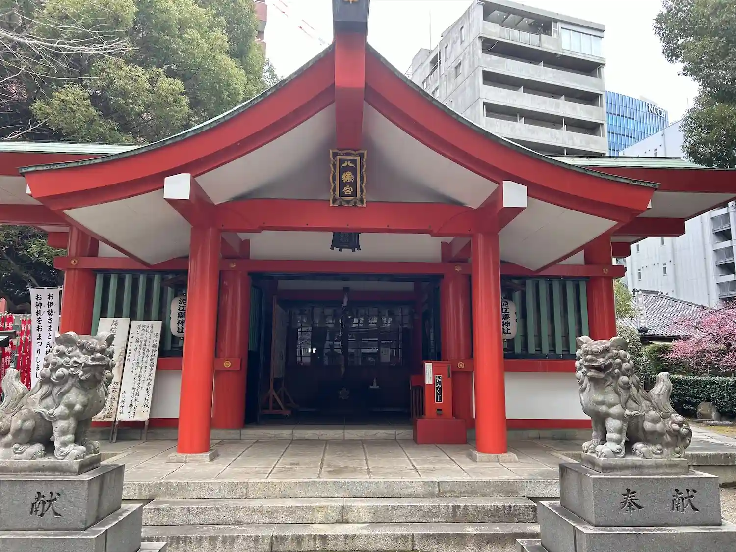 ビルに囲まれている中で、朱色の社がとても目を引きます。