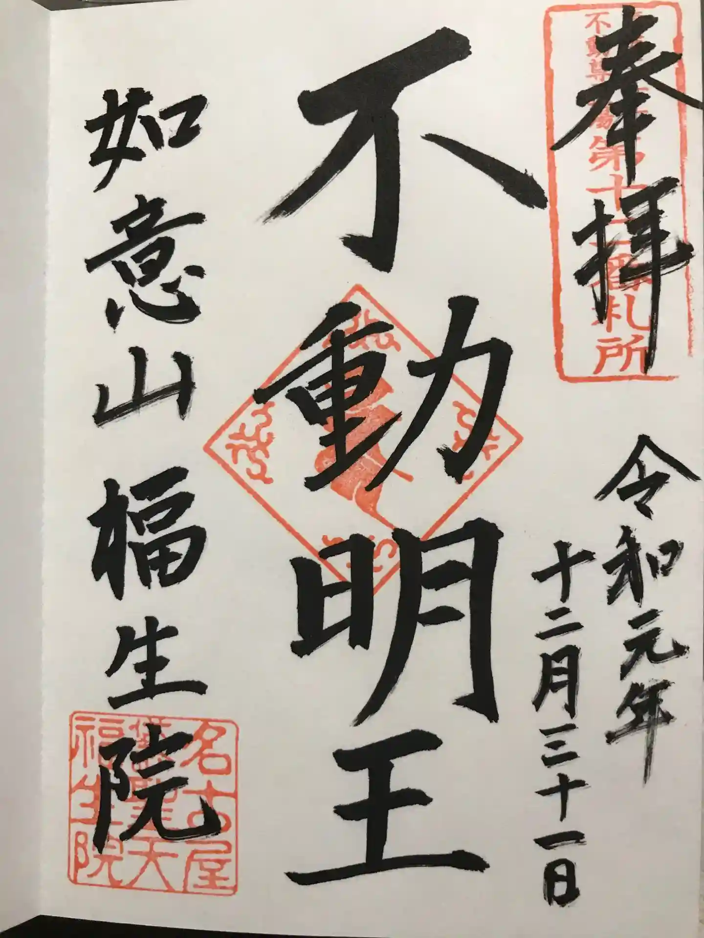 御朱印は3種類ありましたが、今回は不動尊の御朱印とお札をいただきました。