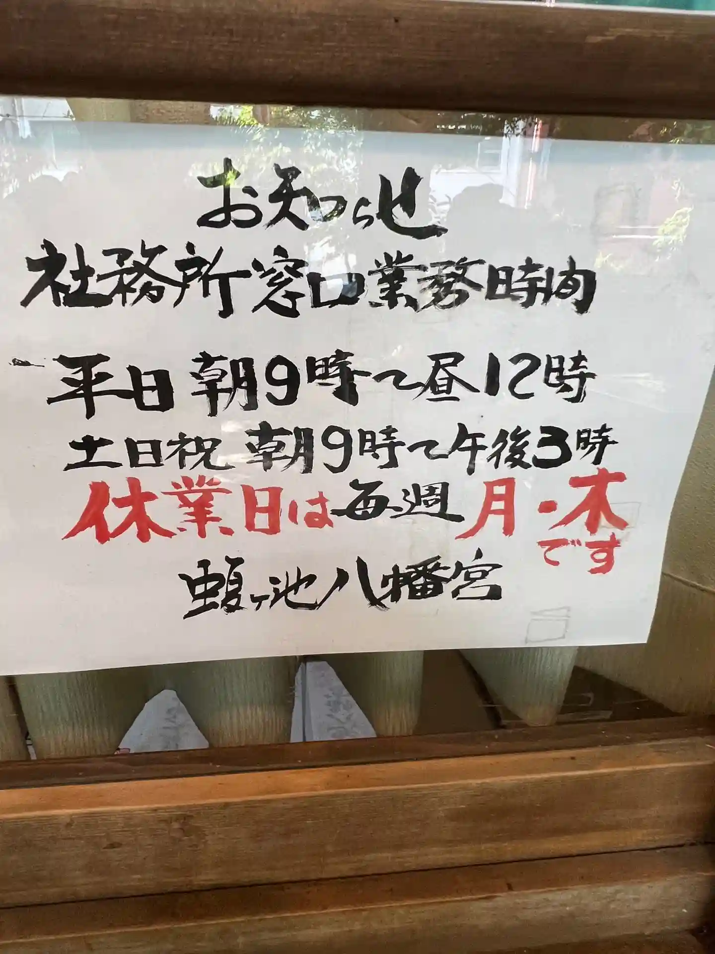 蝮ヶ池八幡宮さんの社務所には、対応時間、休みの曜日の案内が掲示されていました。
