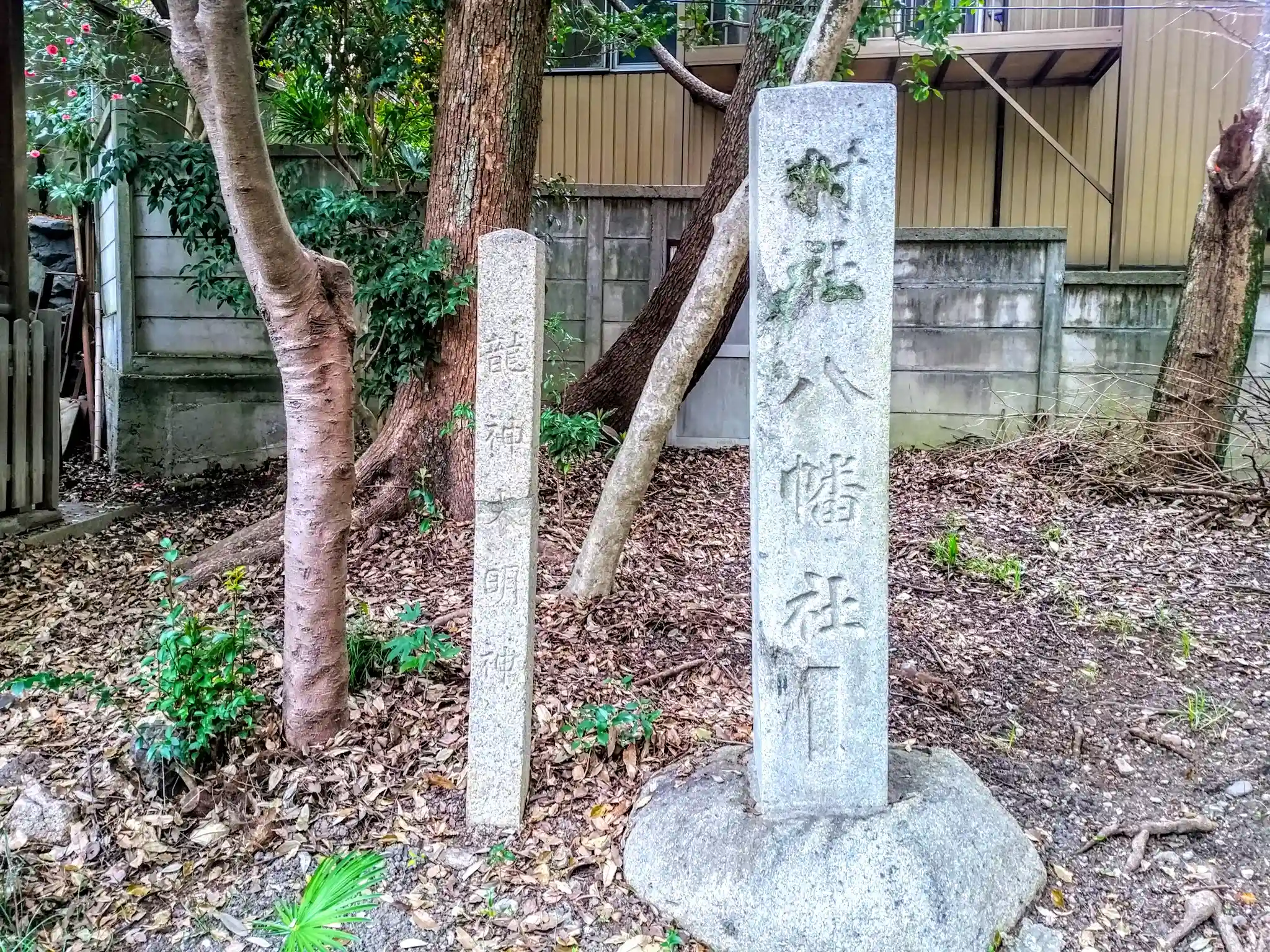 旧社号標 「龍神大明神」「村社八幡社」