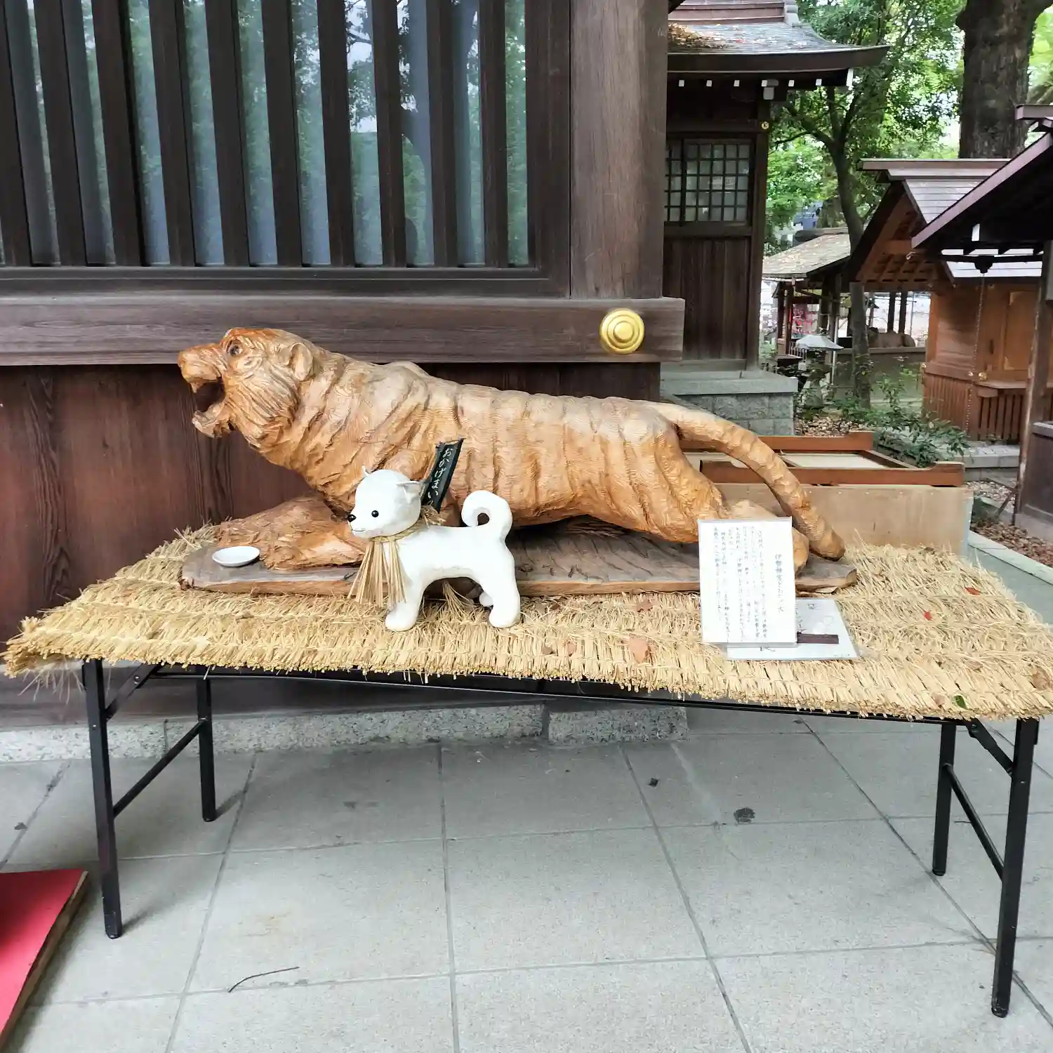 拝殿前の<木彫りの虎>。彫りたてなのか、木材の色が若い。