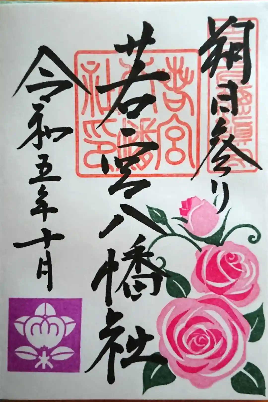 御朱印。毎月1日にはカラフルな御朱印がいただけます。花は毎月変わります。今月はバラ🌹でした・・・