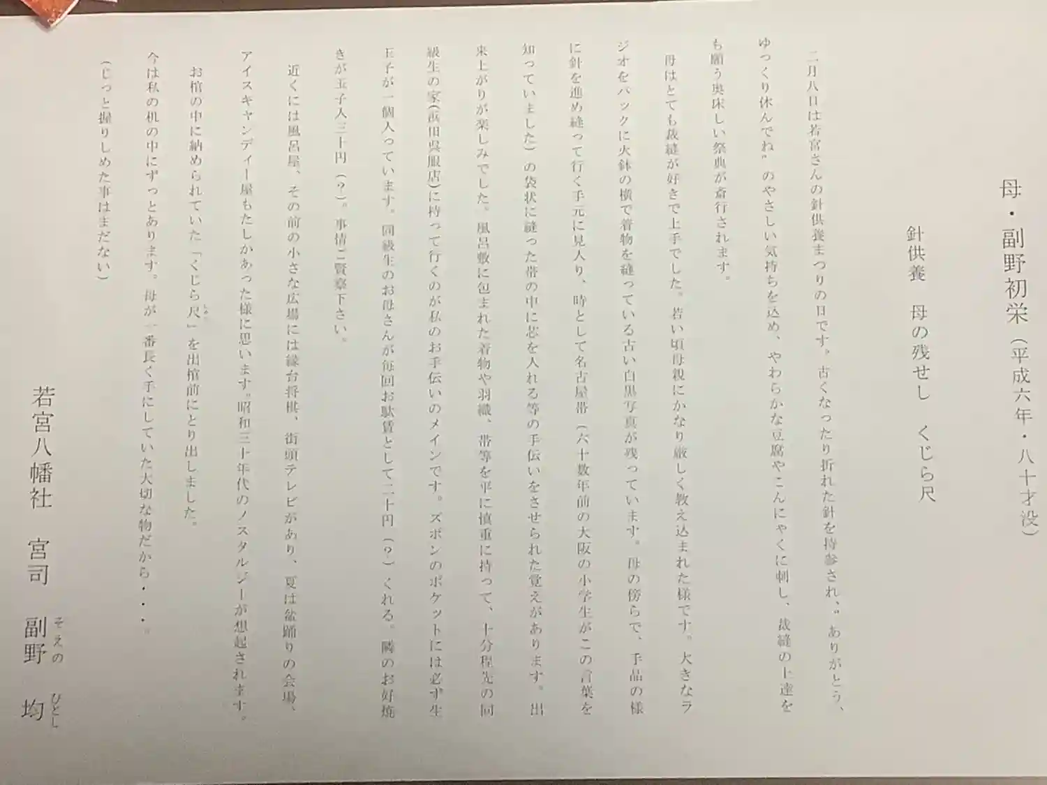 宮司さんの思い出を書かれた文章も一枚、宮司さんがいらっしゃった目の前で頂きましたよ(^◇^;)
