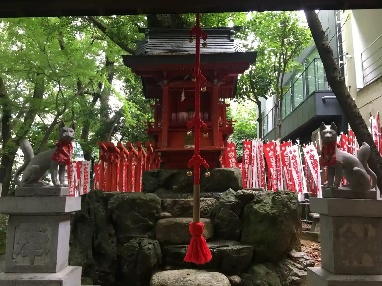 社殿周り全景。名古屋を代表する繁華街・栄にあっても、背の高い古木に覆われた空気感のある静かな境内。