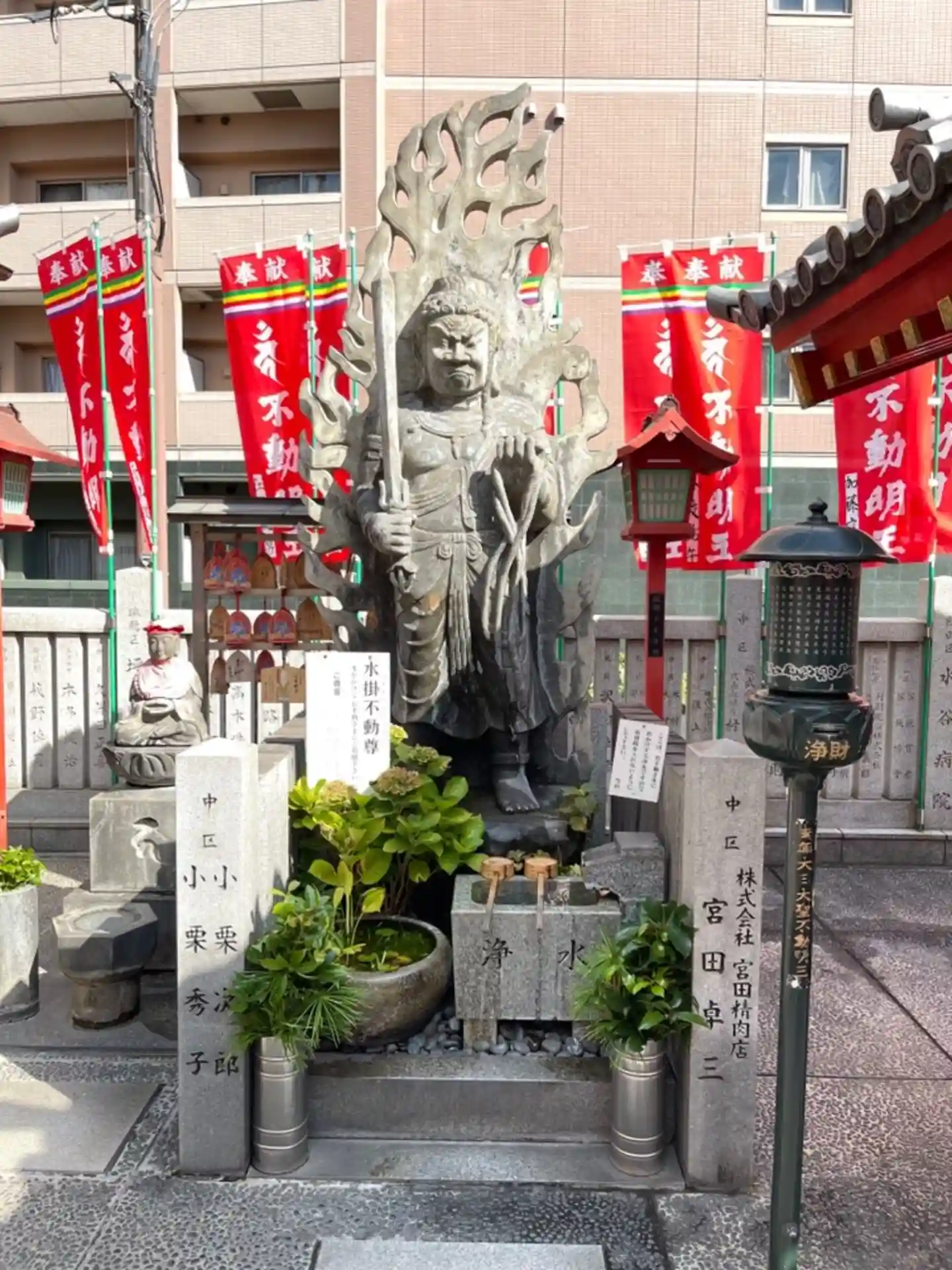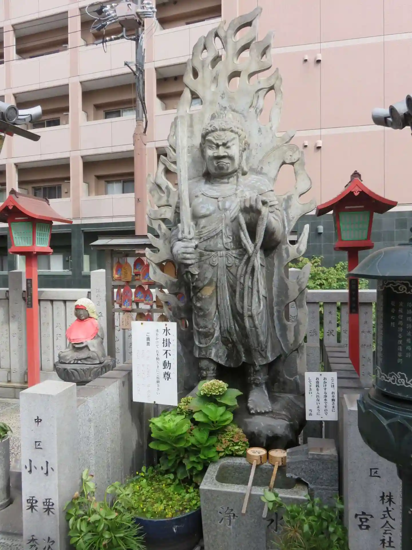 境内には水掛不動尊の像があります。