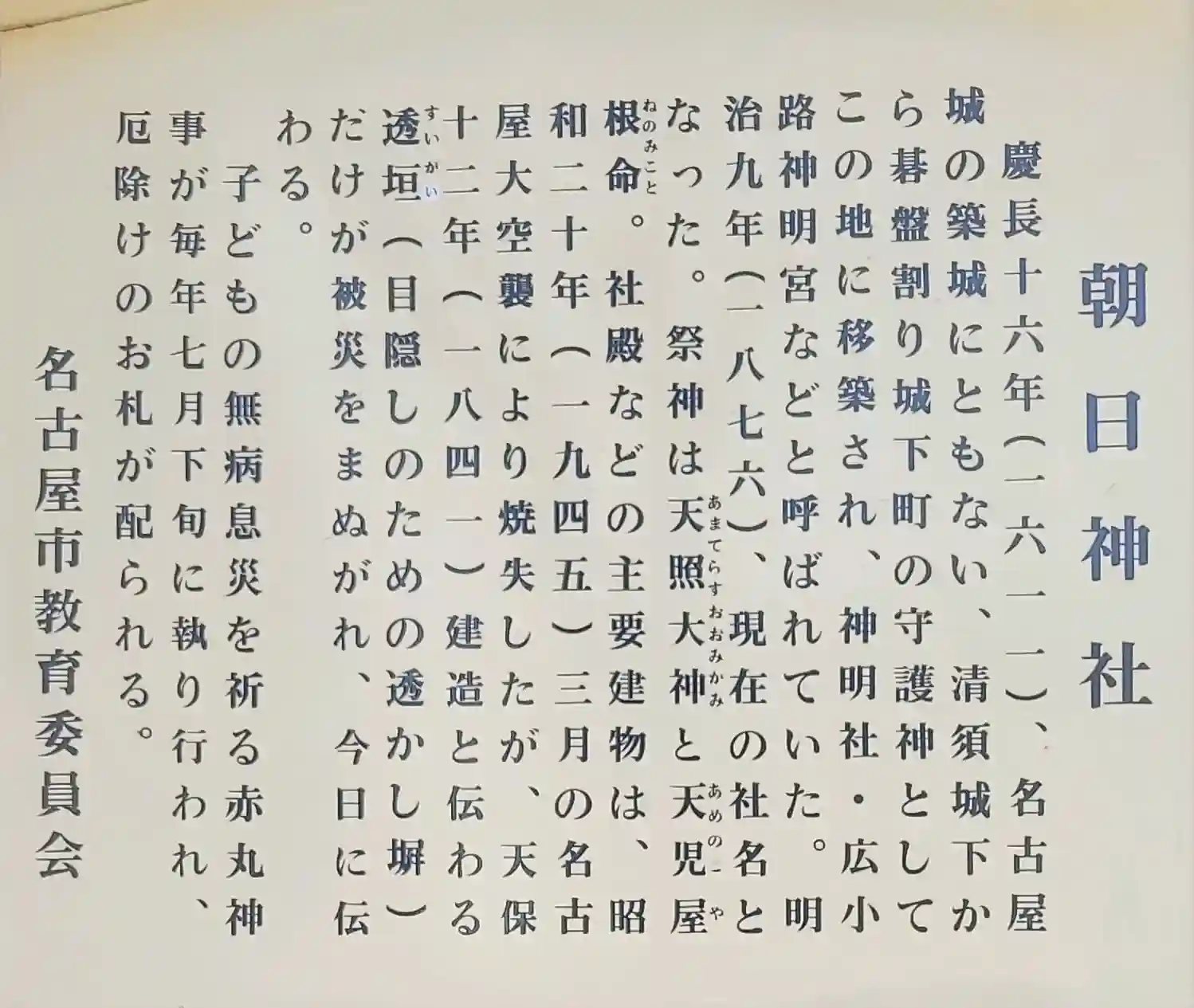 慶長16年の夏、名古屋城築城に伴い徳川家康の請願により清州城下の朝日郷より移築遷座された。朝日神社は家康公の正室朝日姫の氏神様であり、朝日姫とともに清州から当地へ移った人々の崇敬を集めた。
