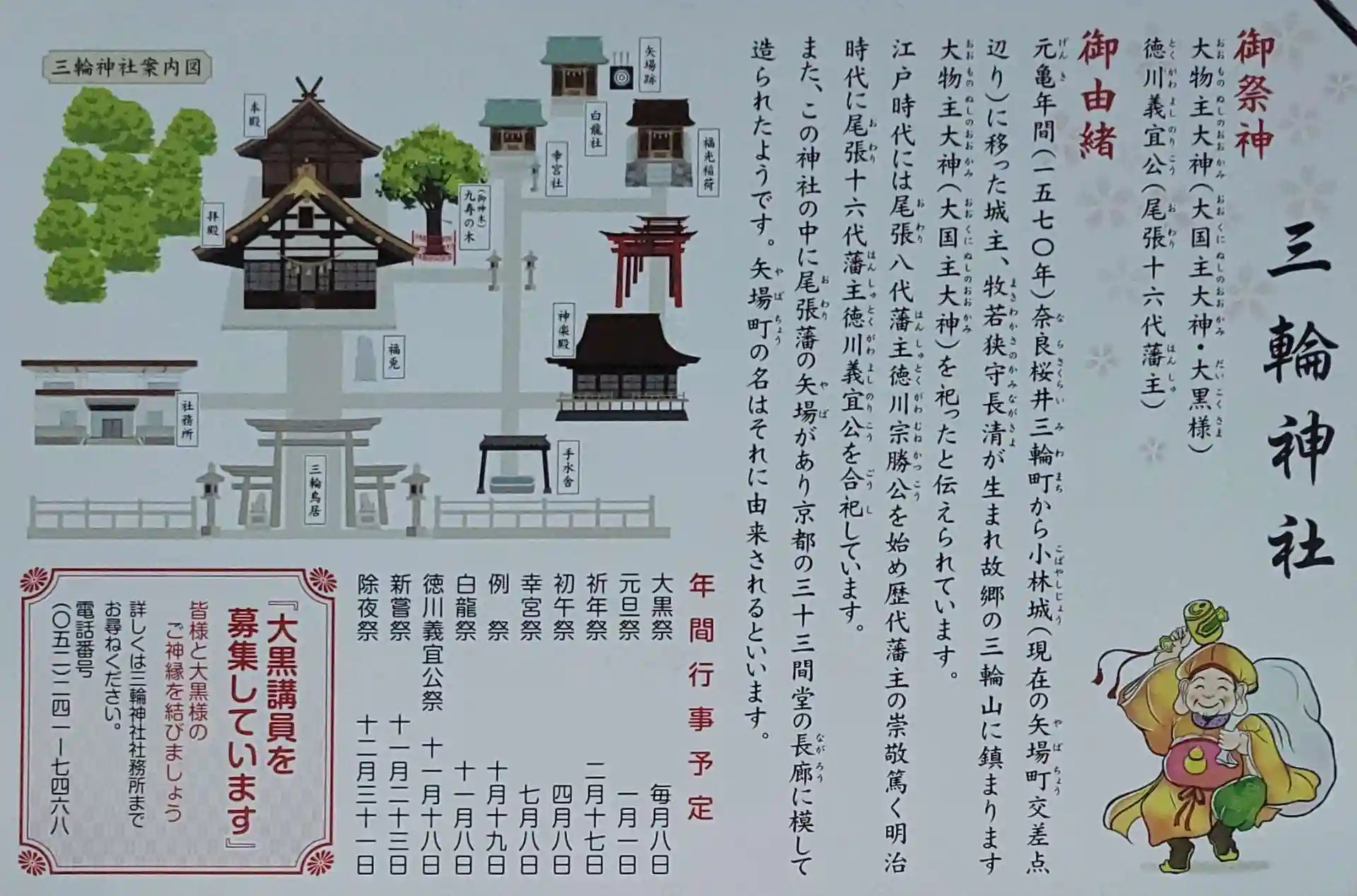 元亀年間(1570~1572)奈良桜井三輪町から小林城(現在の矢場町交差点辺り)に移った牧若狭守長清公が崇敬する故郷大和三輪山に大物主神(大国主神・大黒様)を鎮め祭ったのが始まりと伝わります。