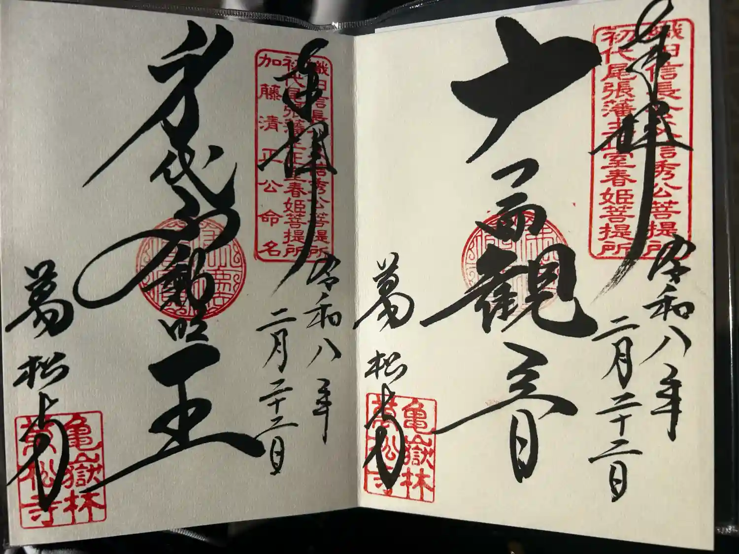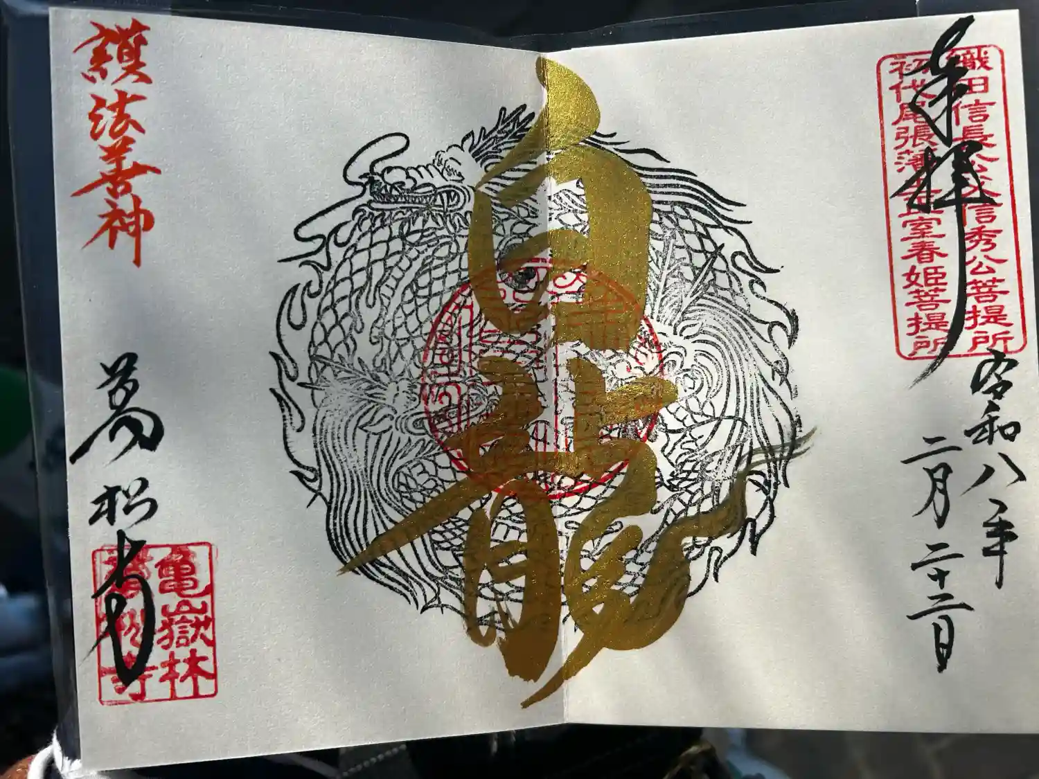 | 御朱印 | あり 真ん中に十一面観音、左下に萬松寺と書かれ、右上に織田信長公父信秀公菩提所・初代尾張藩主正室春姫菩提所の印、真ん中に仏法僧宝の印、左下に亀岳林萬松寺の印が押されています。