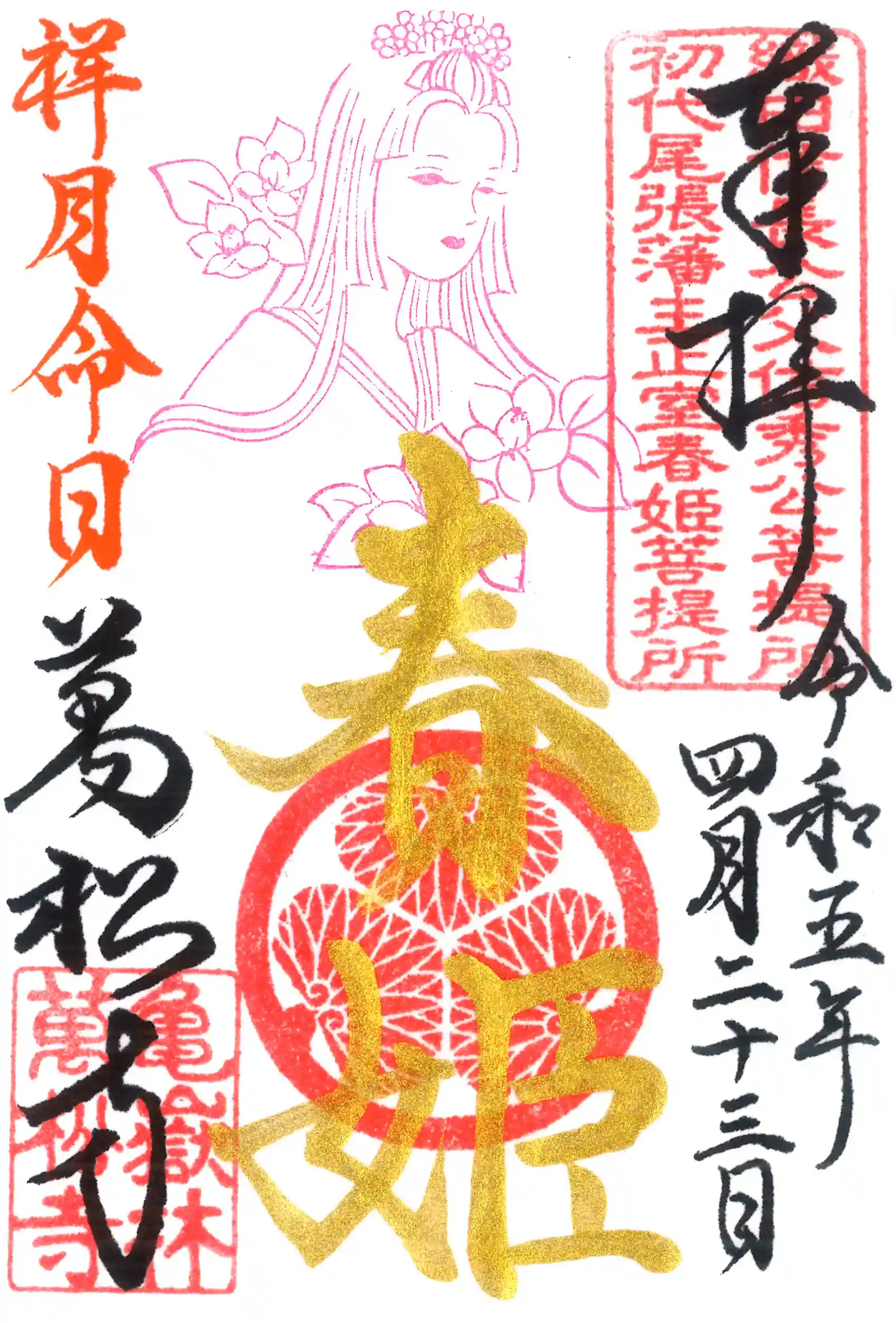 春姫様のお姿を描いた片面の御朱印をご命日である23日限定で授与いたします。