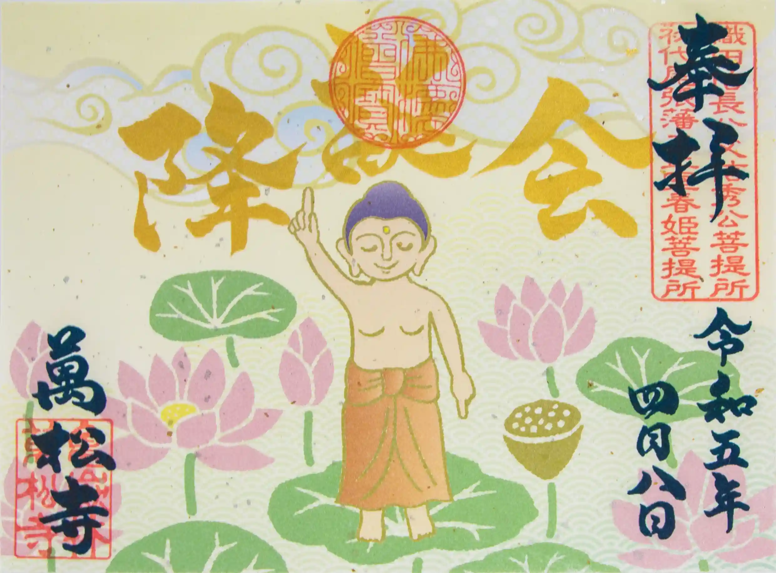 お釈迦様の誕生を祝し、蓮の花が咲き誇り、空一面を明るく照らしている様子をイメージした御朱印に仕上げました。
