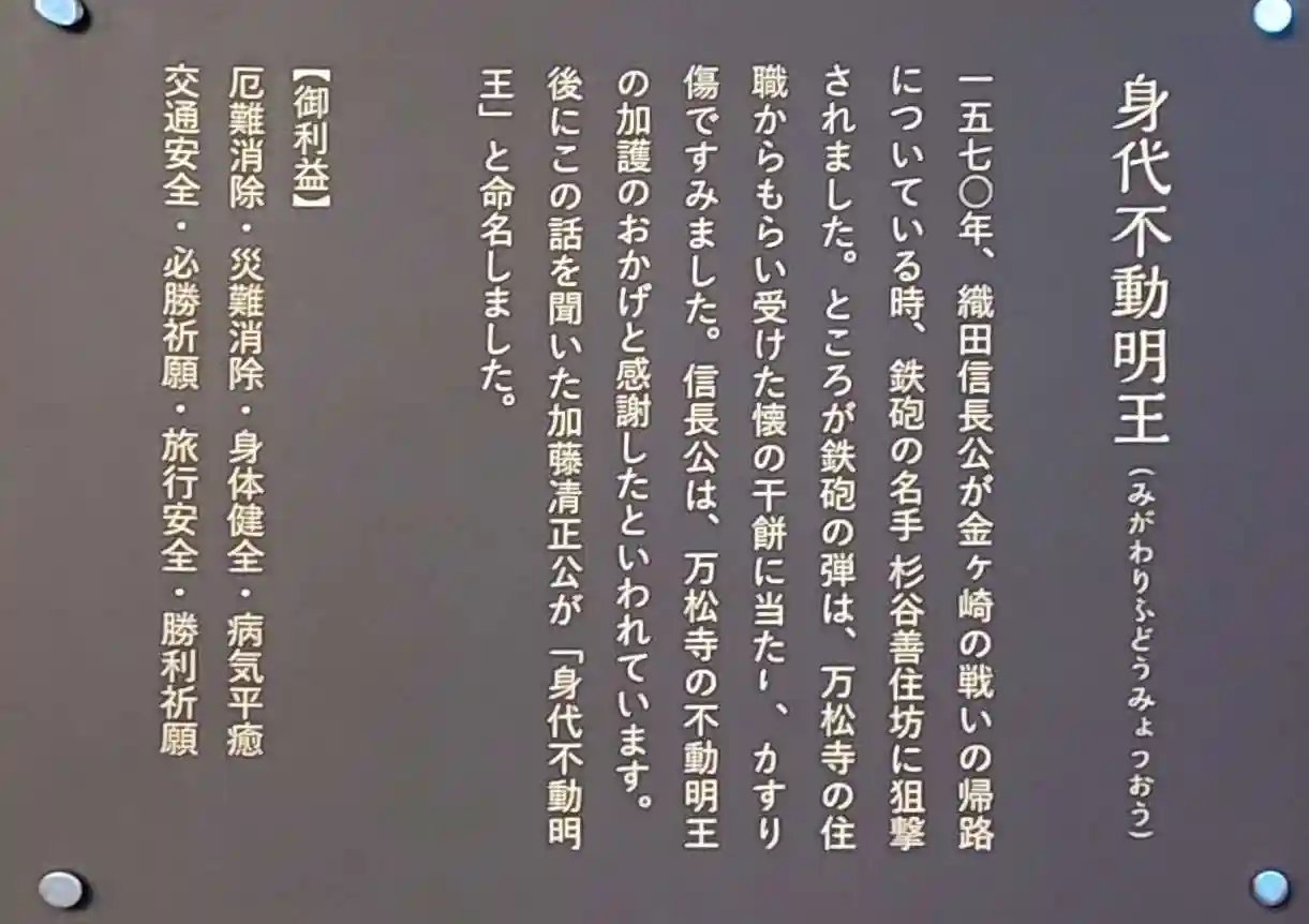 また、信長公が狙撃にあった際、懐に入れてあったこちらのご住職からもらった干餅に弾があたり、かすり傷ですんだとのこと。不動明王の御加護と感謝したとされ、後に加藤清正公が身代不動明王と命名しています。