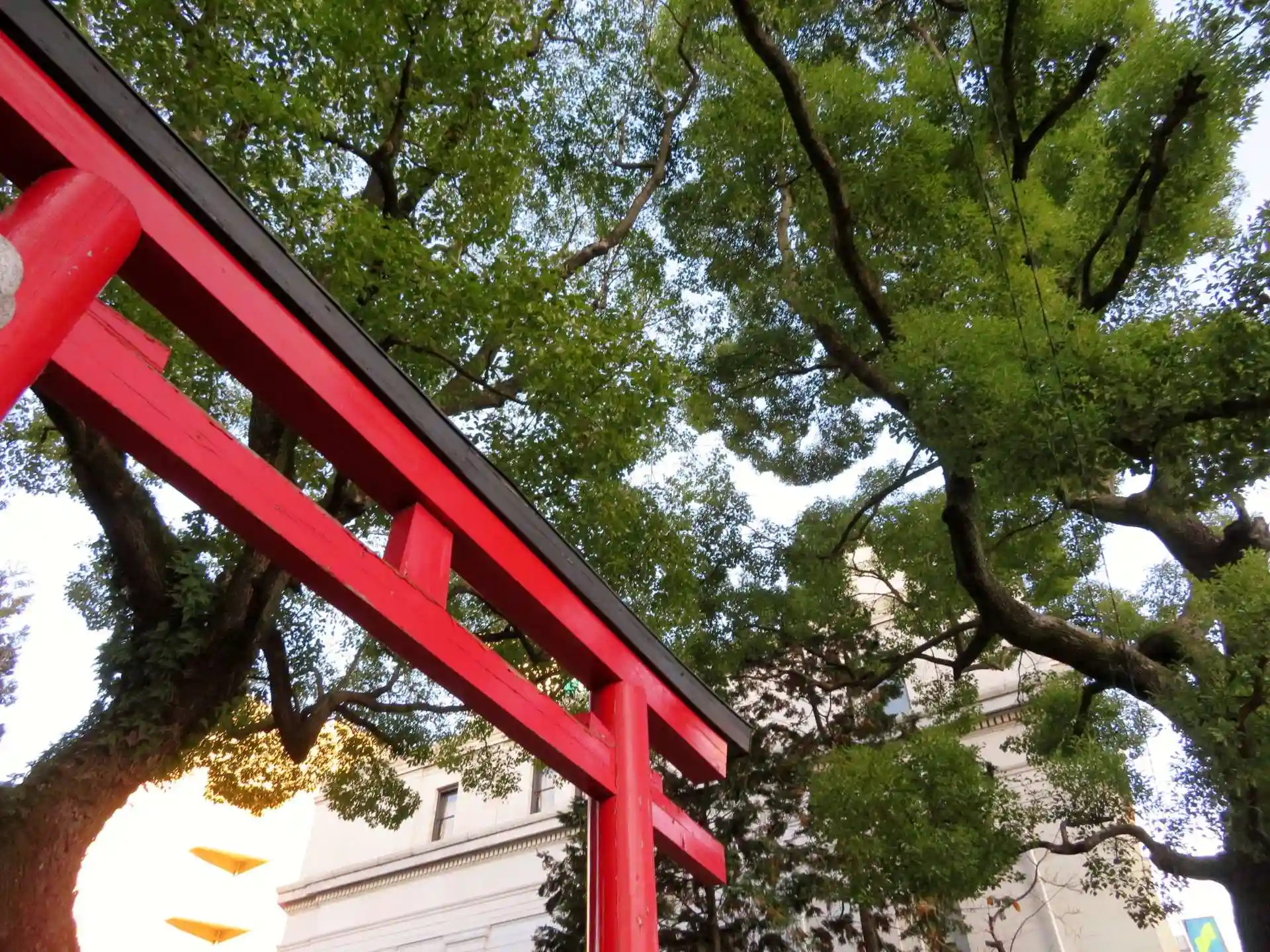 大須の人通りが多い道沿いに朱塗りの鳥居や社殿が映えます。