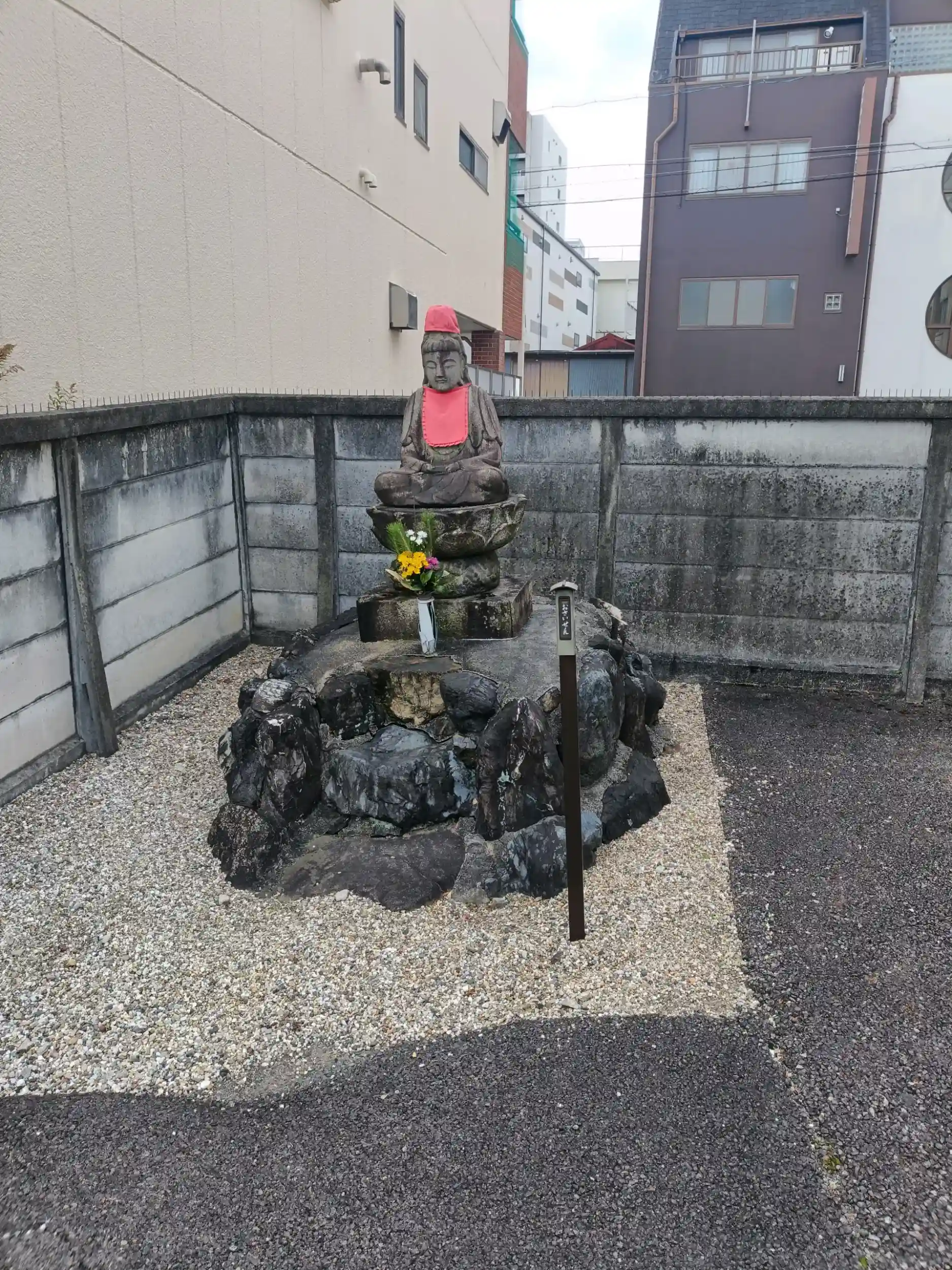 本堂と反対側の隅に観音様の石像が立っています。