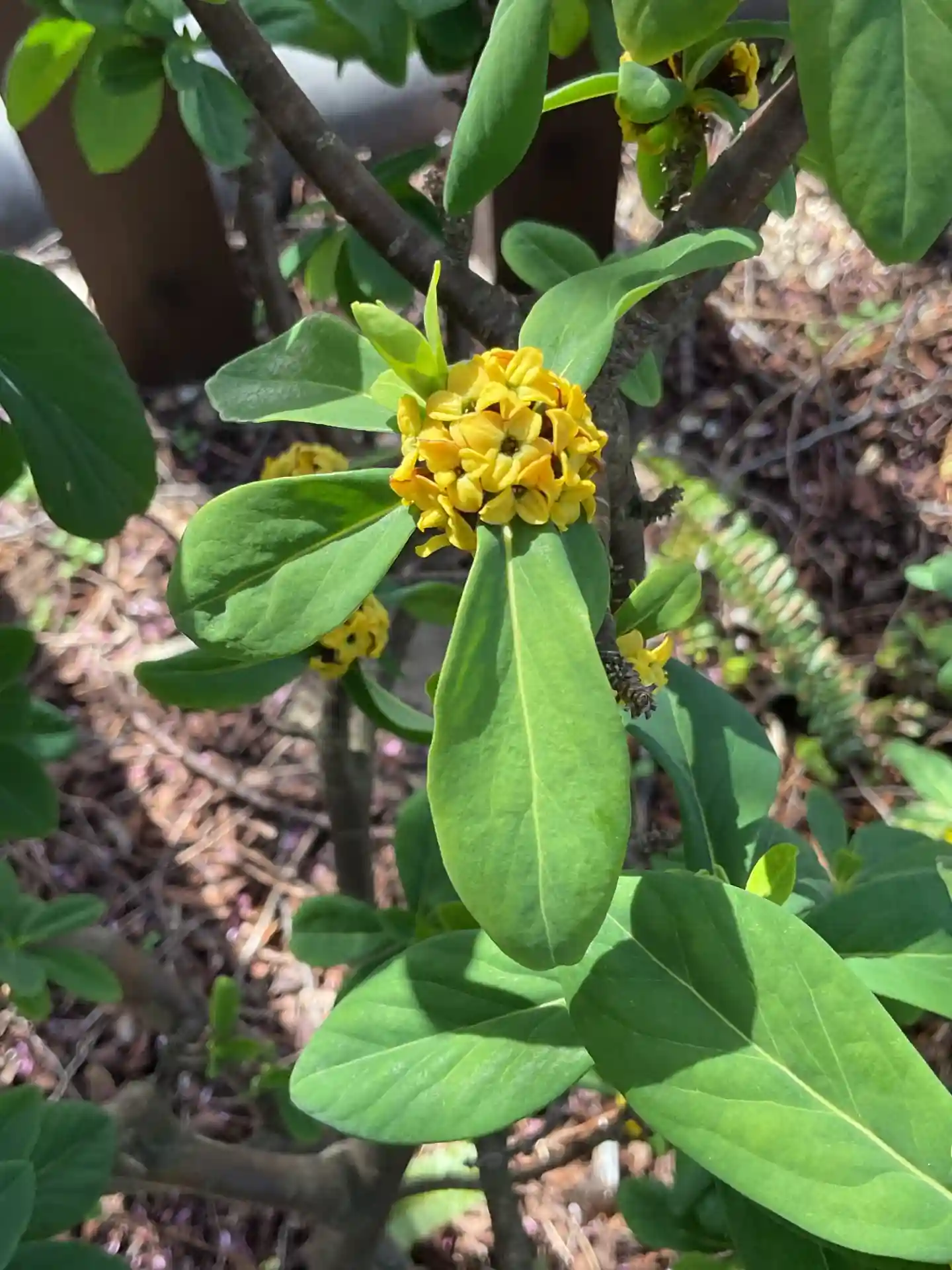 沈丁花の花が黄色で葉っぱが夏に落ちることからナツボウズという名前だとか。