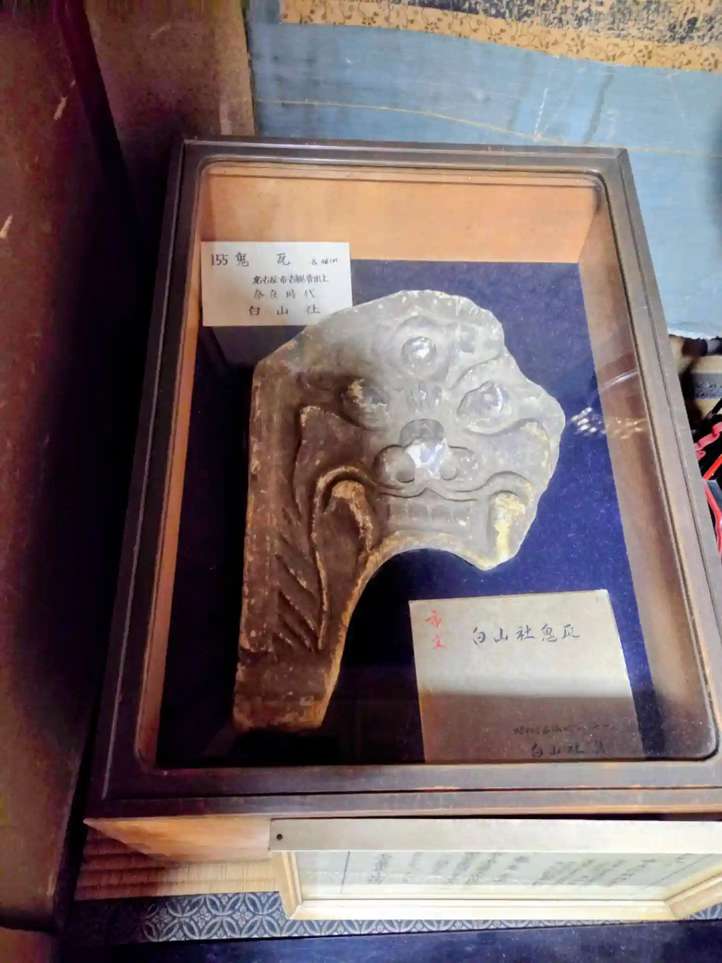 こちらは古墳上に鎮座しており、先ほどの御器所西城を築城した佐久間氏の家臣だった服部氏が佐久間氏の賤ヶ岳の戦いの敗北後この地に帰農。後に総一郎善昌が白山神社を勧請したものです。元は隣の善昌寺の境内社でしたが、明治の廃仏毀釈により独立。氏子さんが社務所に詰めており、ちいさな書置きの御朱印を戴きました。更に社務所内に上げて頂き、貴重な奈良時代の鬼瓦を拝見させていだきました。