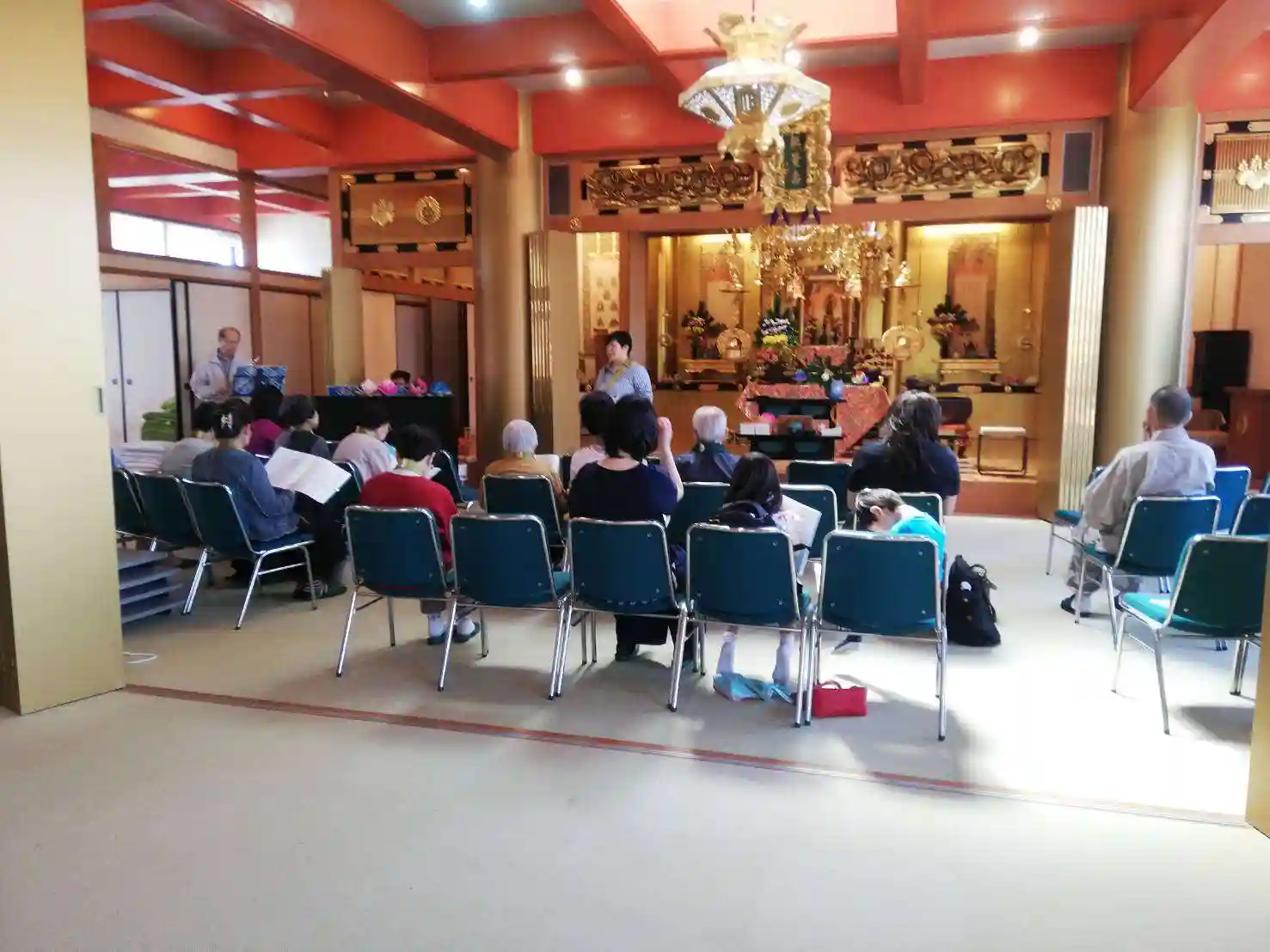 お経は、ご本尊の阿弥陀様をみながら読めるように、手書きで、イーゼルに設置したものを紙芝居のようにめくります。