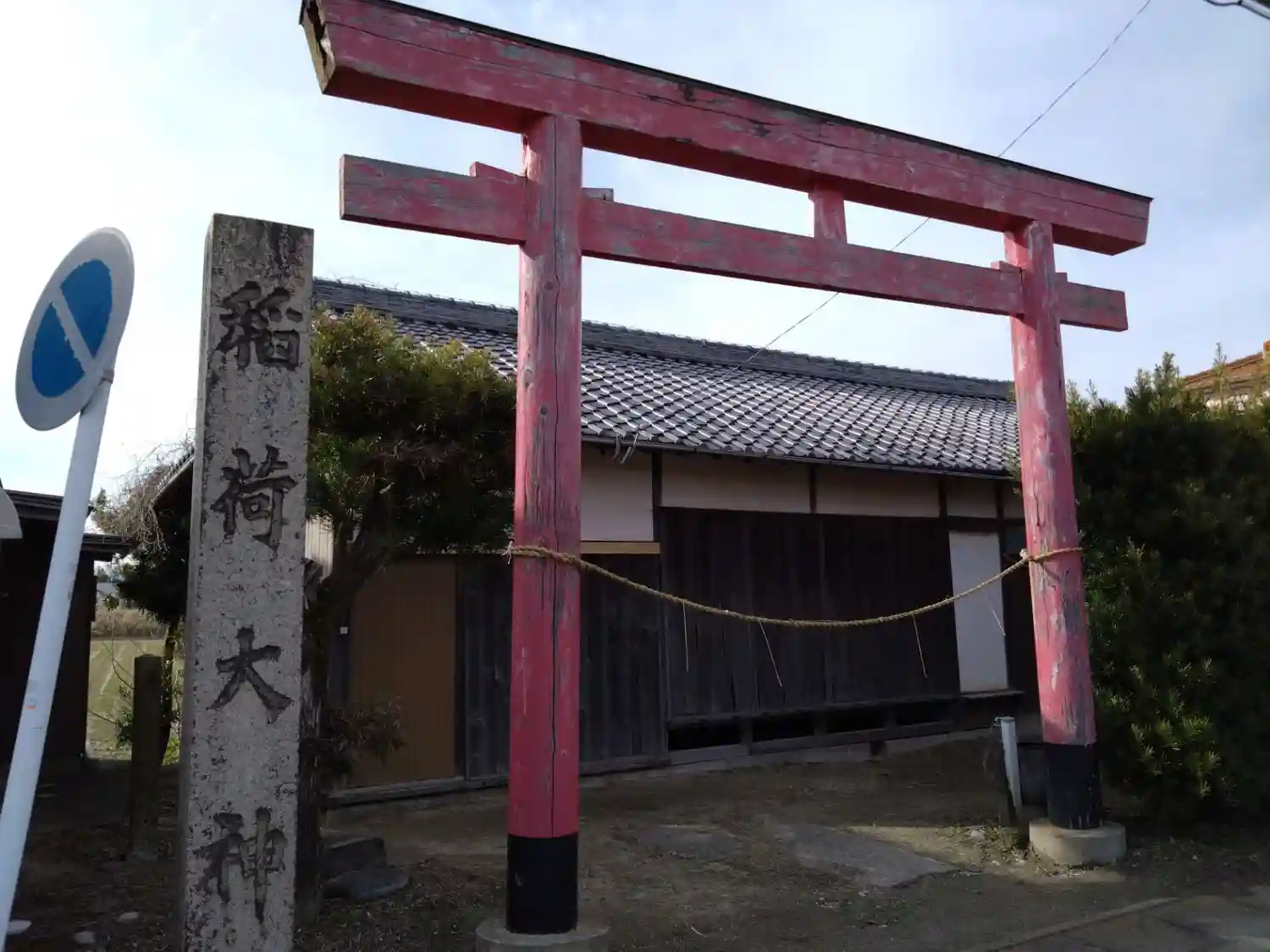 道路を走っていると突然赤い鳥居が現れます。でも社がぱっと見たところわかりません。